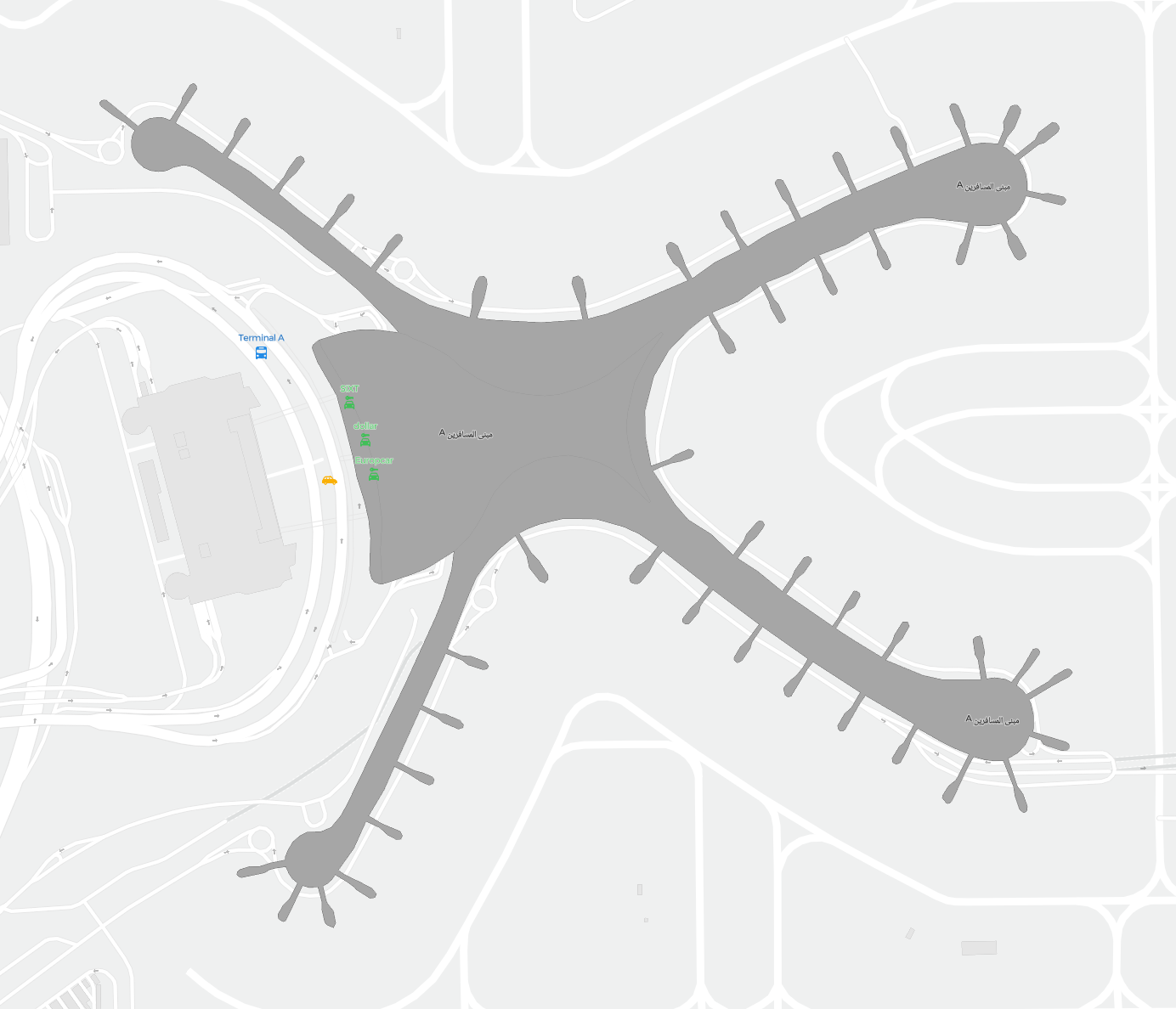 Este es un mapa ampliable de Abu Dabi (AUH). Ofrece una visión general del exterior con terminales y estacionamientos. En algunos aeropuertos también muestra detalles de puertas, servicios de coches de alquiler y otras comodidades al hacer zoom.