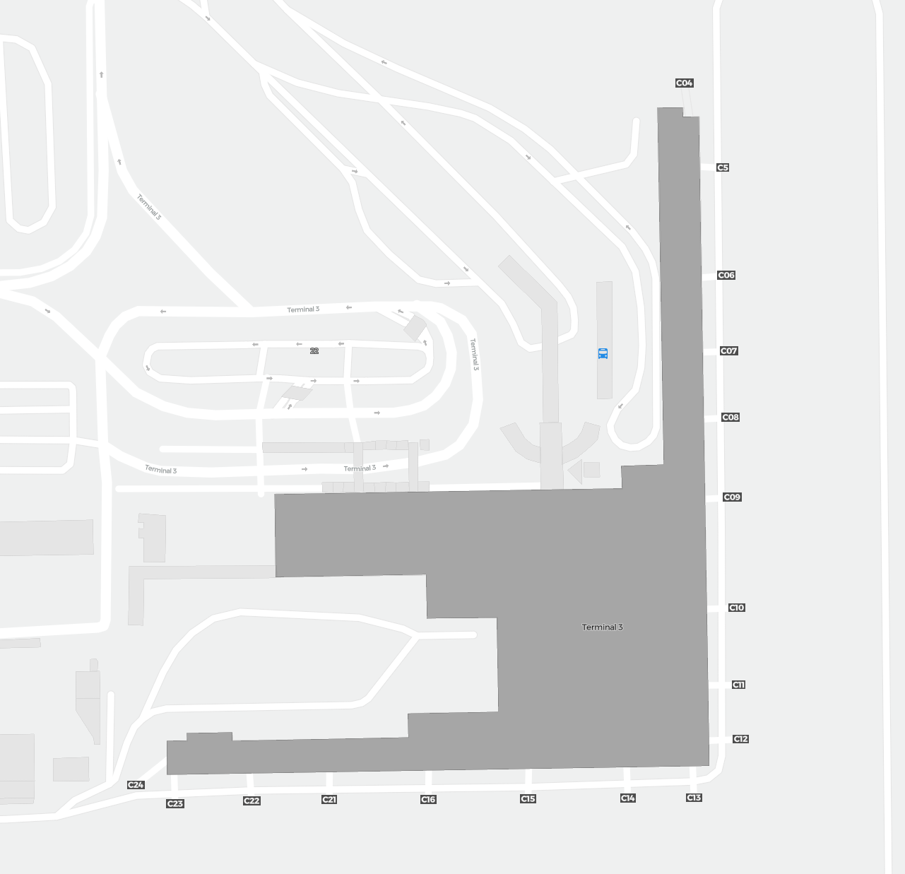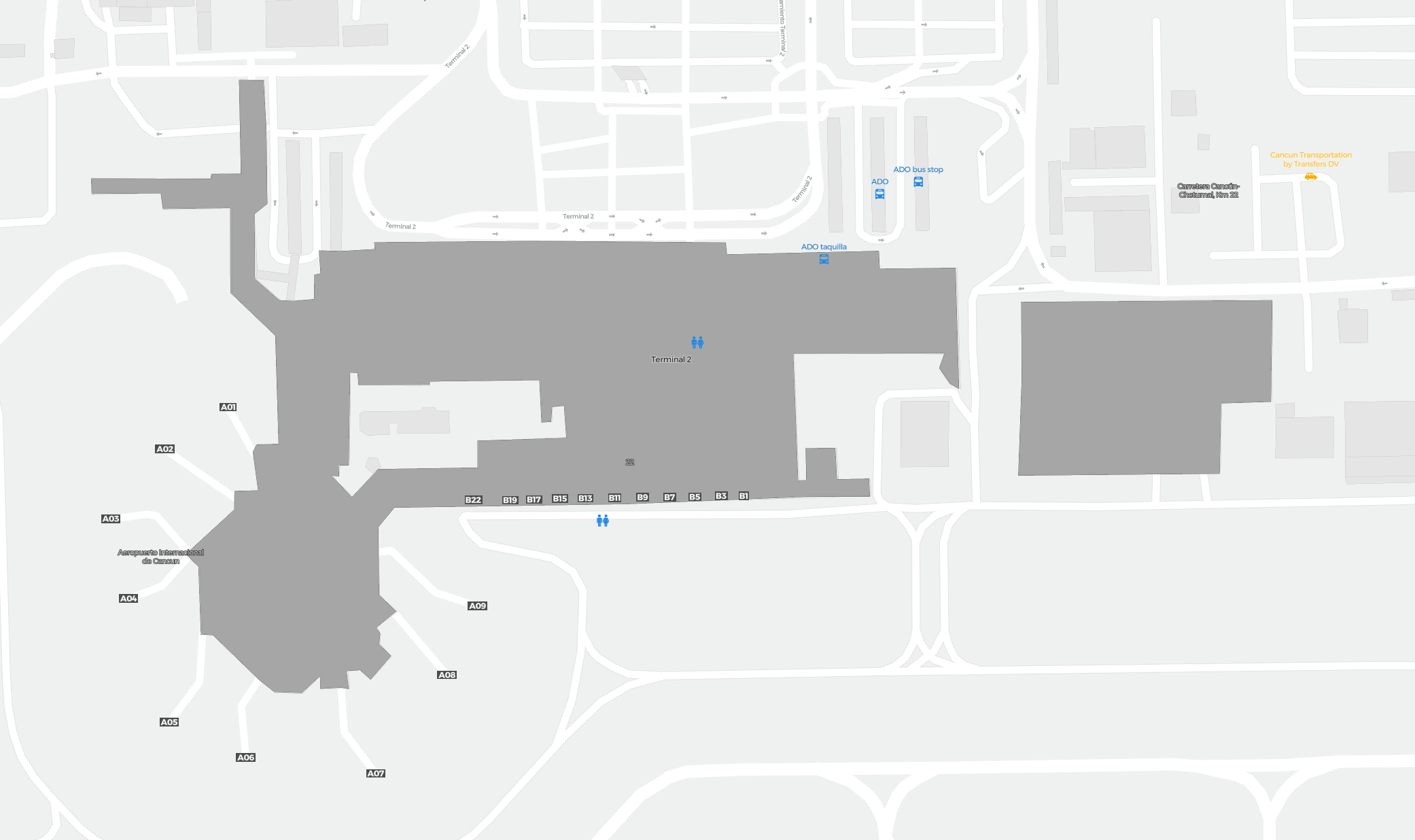 Este es un mapa ampliable de Cancún (CUN). Ofrece una visión general del exterior con terminales y estacionamientos. En algunos aeropuertos también muestra detalles de puertas, servicios de coches de alquiler y otras comodidades al hacer zoom.