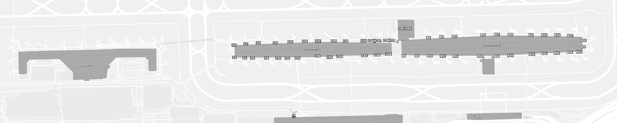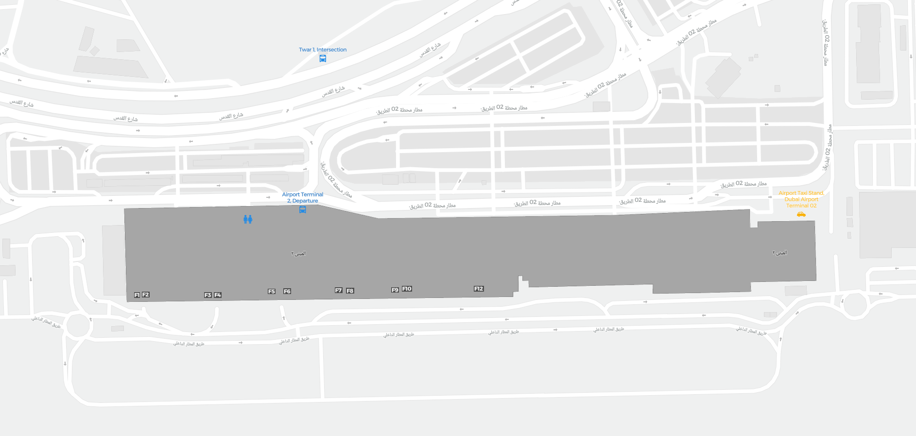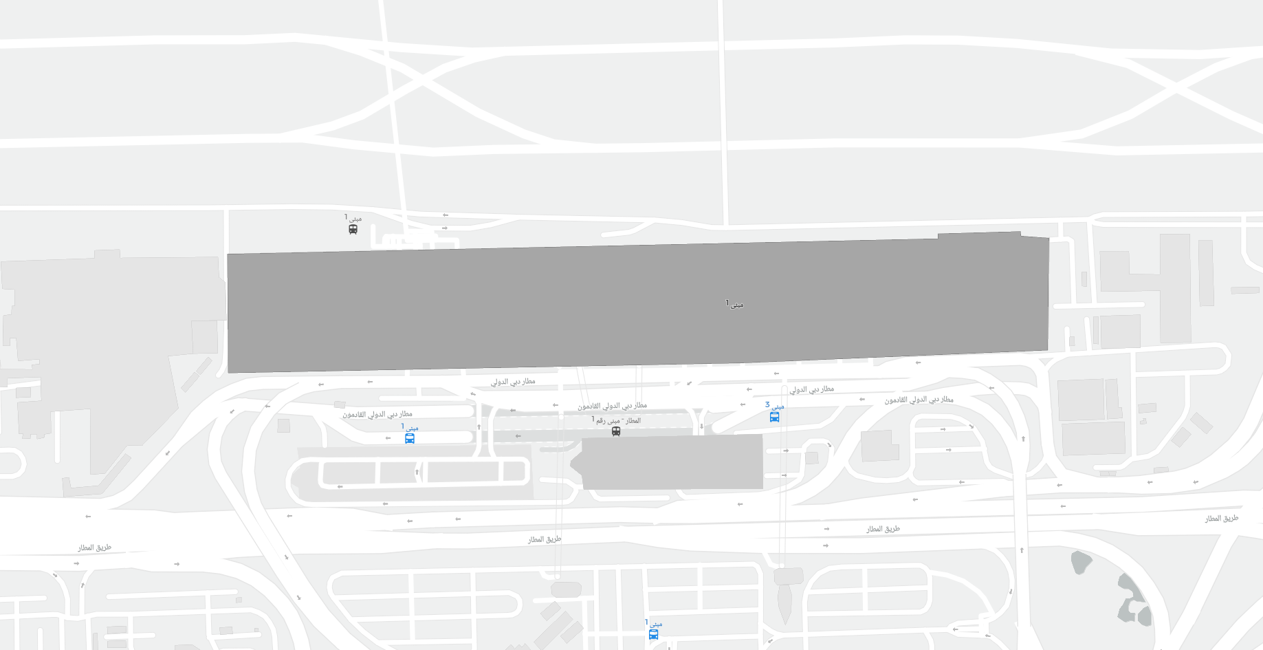 Este es un mapa ampliable de Dubái (DXB). Ofrece una visión general del exterior con terminales y estacionamientos. En algunos aeropuertos también muestra detalles de puertas, servicios de coches de alquiler y otras comodidades al hacer zoom.