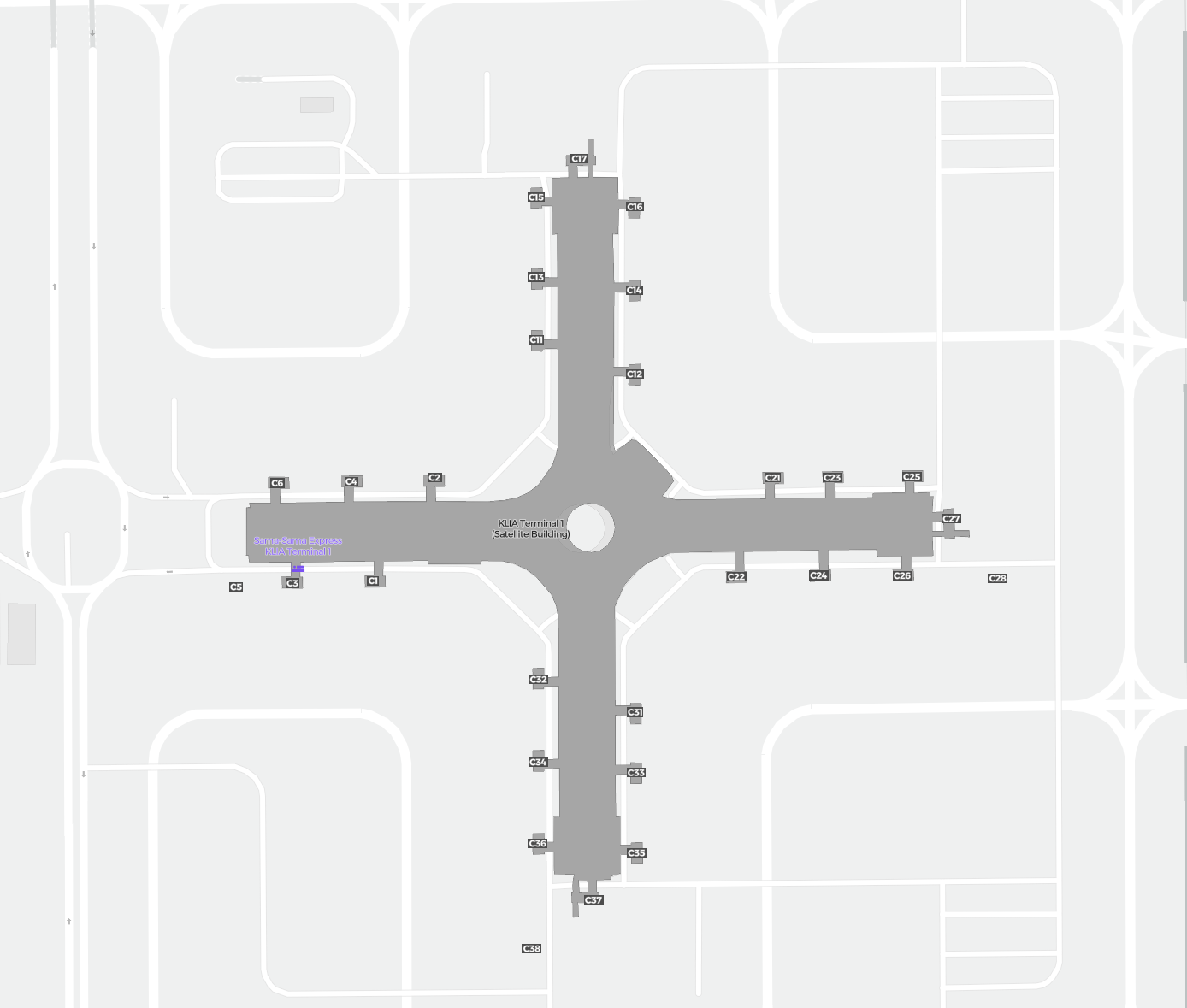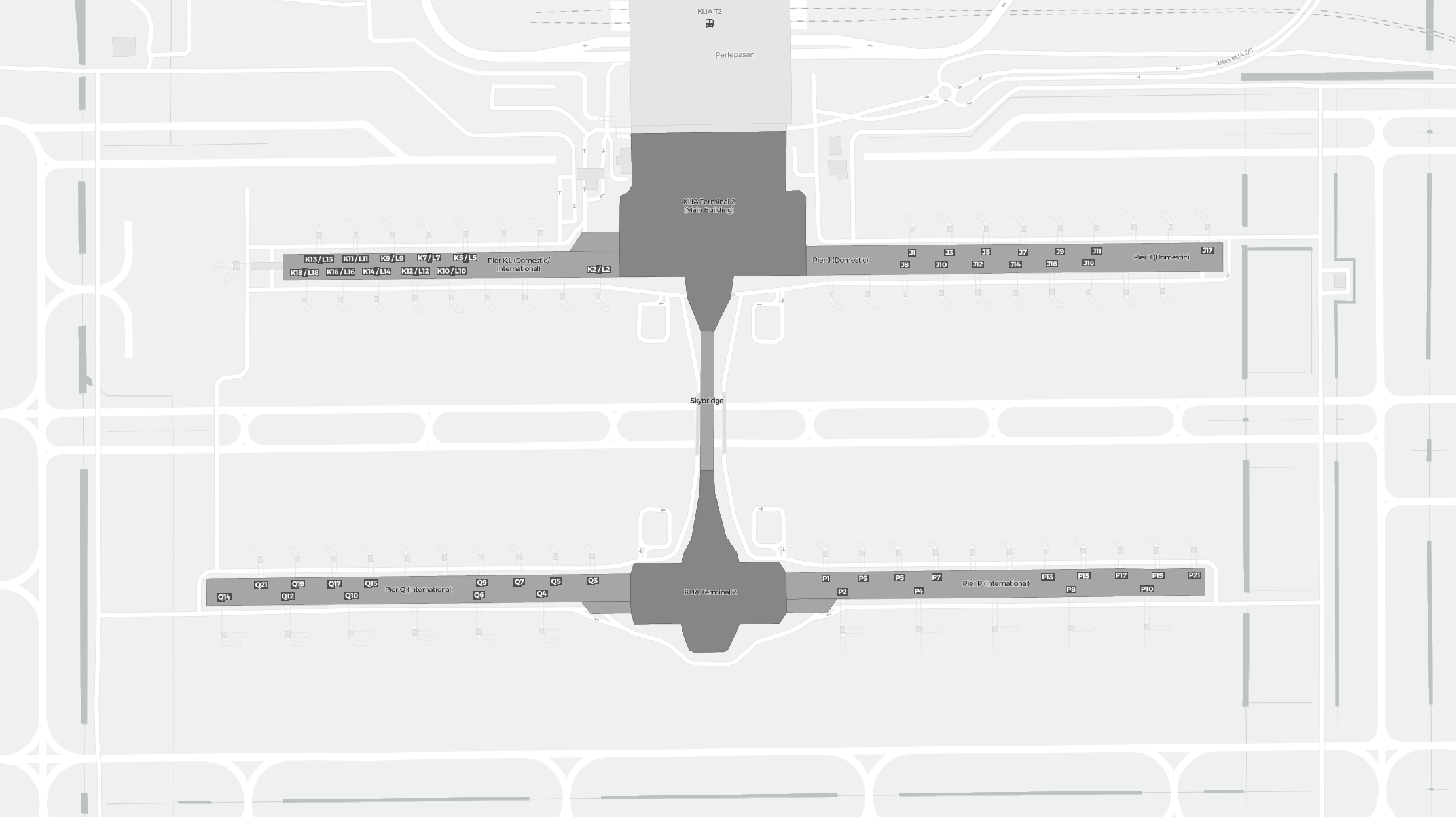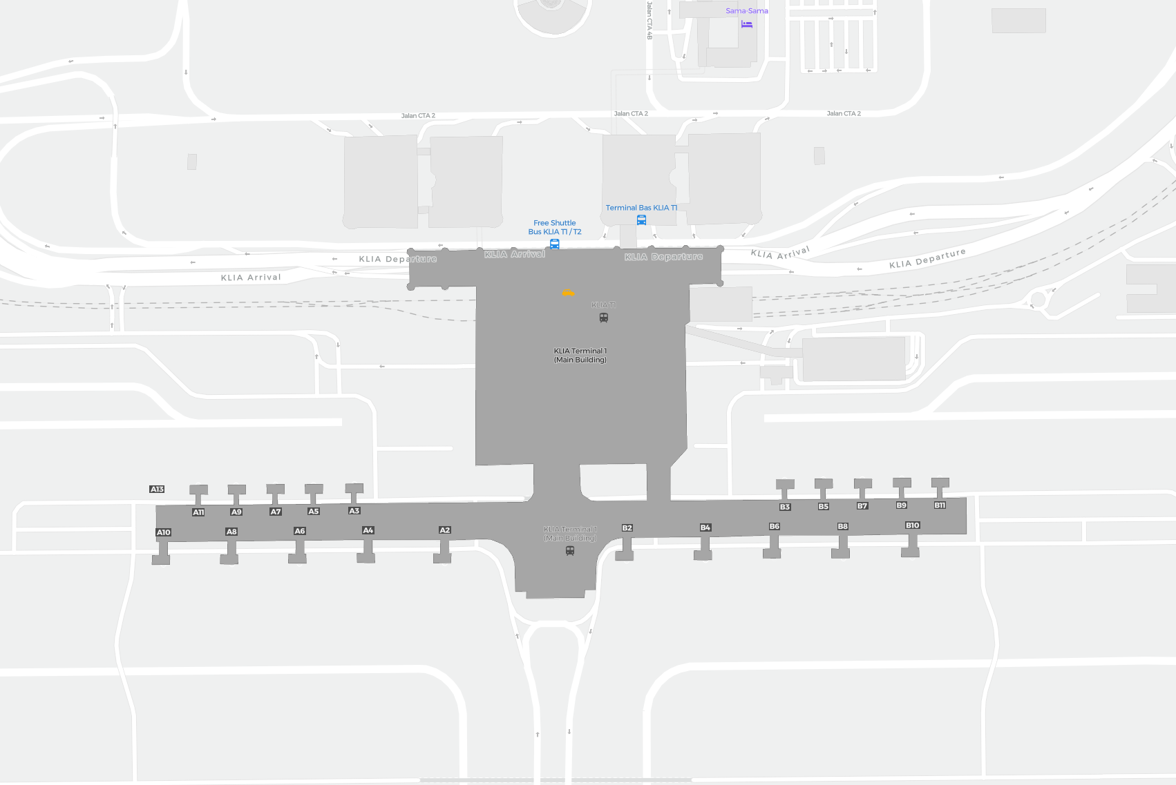 Este es un mapa ampliable de Kuala Lumpur (KUL). Ofrece una visión general del exterior con terminales y estacionamientos. En algunos aeropuertos también muestra detalles de puertas, servicios de coches de alquiler y otras comodidades al hacer zoom.