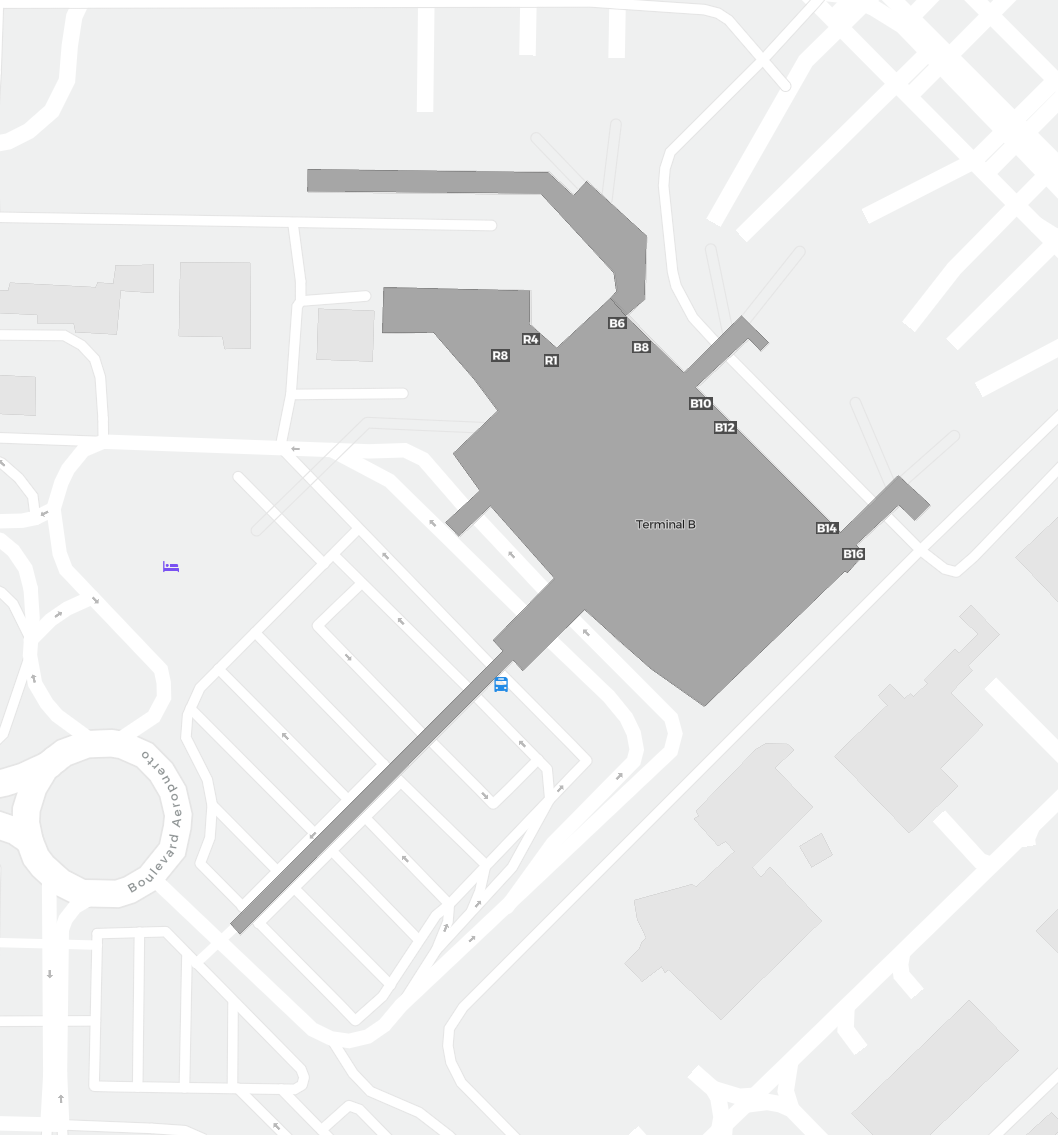 Este es un mapa ampliable de Monterrey (MTY). Ofrece una visión general del exterior con terminales y estacionamientos. En algunos aeropuertos también muestra detalles de puertas, servicios de coches de alquiler y otras comodidades al hacer zoom.