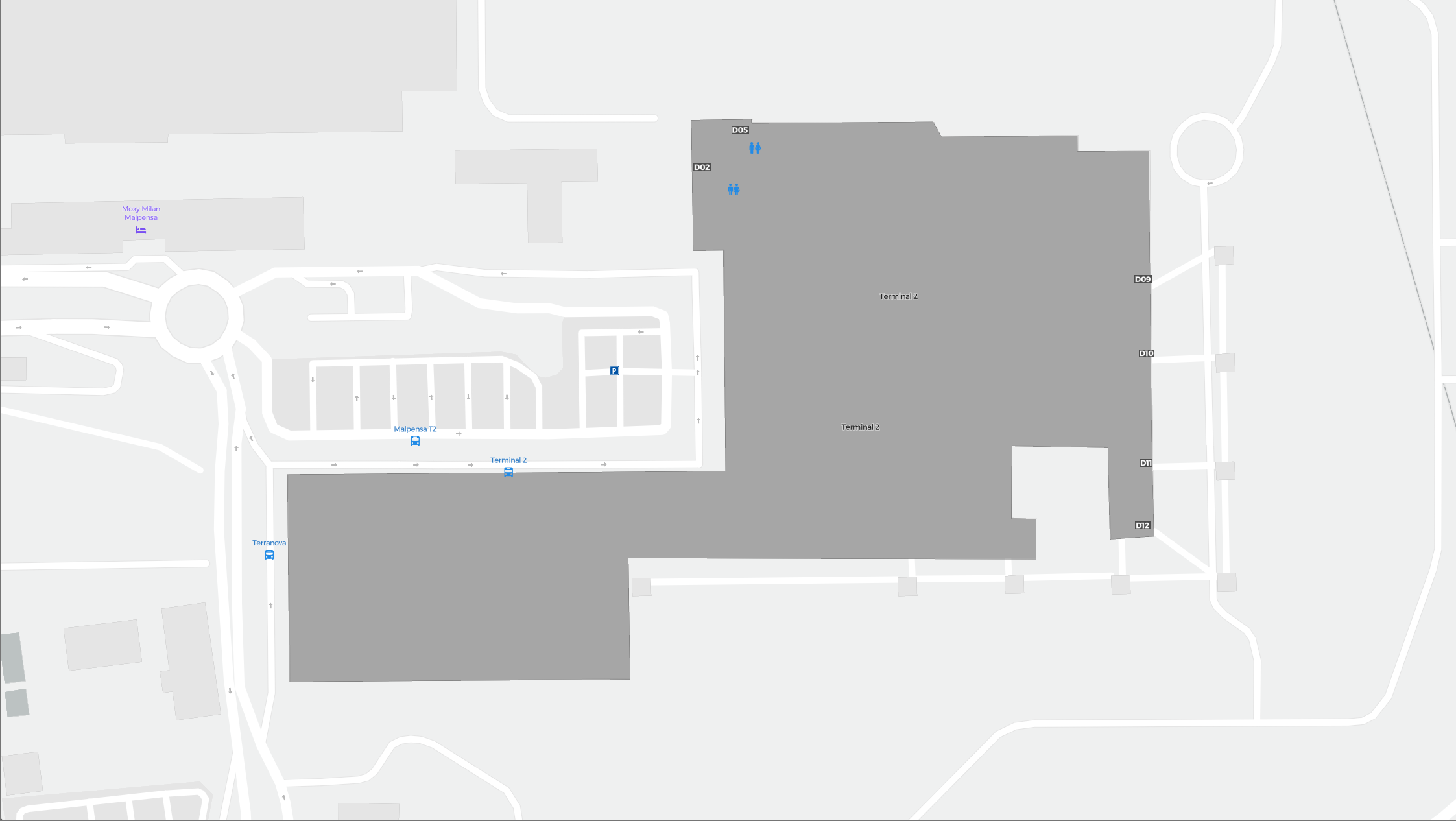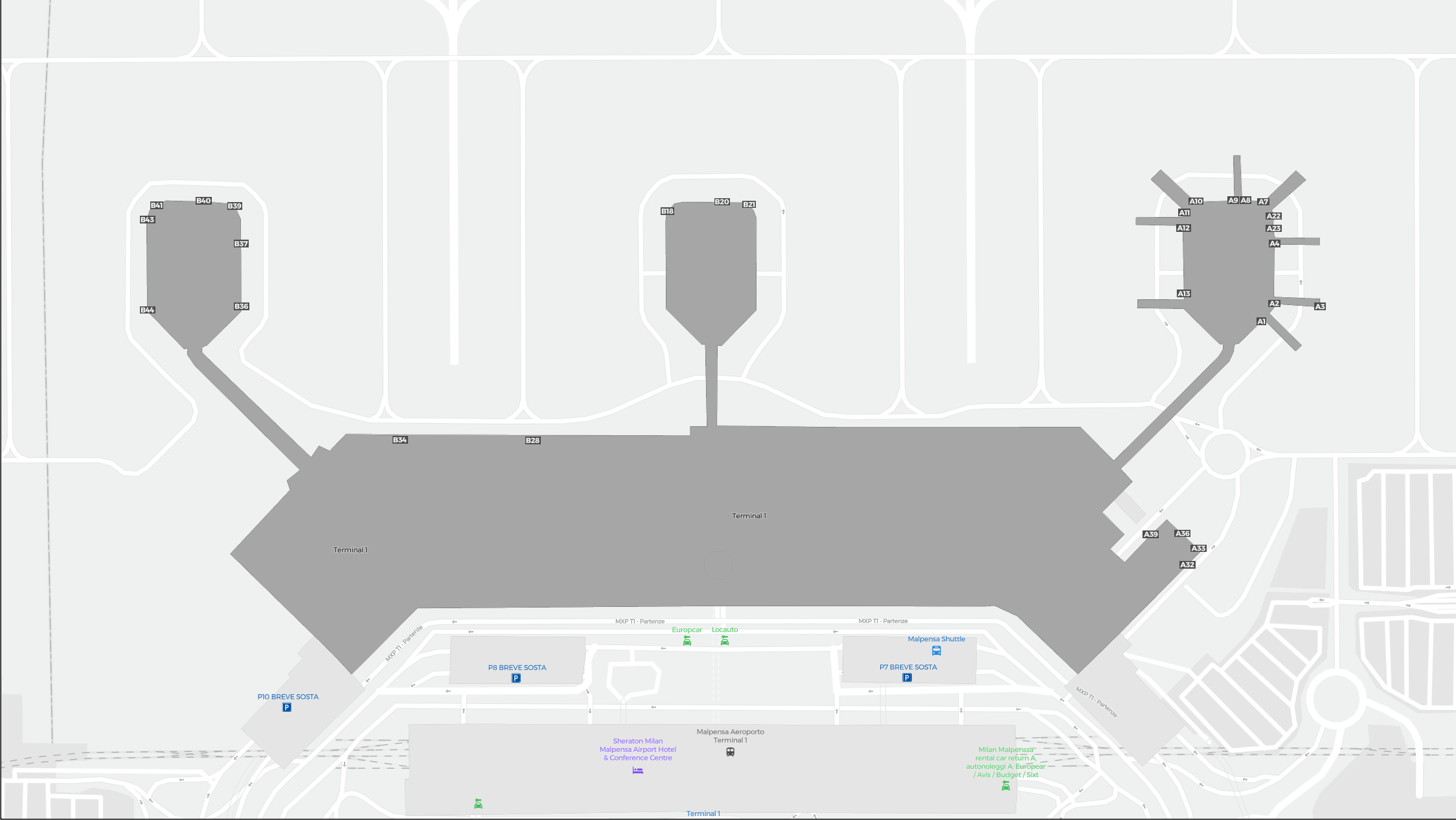 Este es un mapa ampliable de Milán (MXP). Ofrece una visión general del exterior con terminales y estacionamientos. En algunos aeropuertos también muestra detalles de puertas, servicios de coches de alquiler y otras comodidades al hacer zoom.