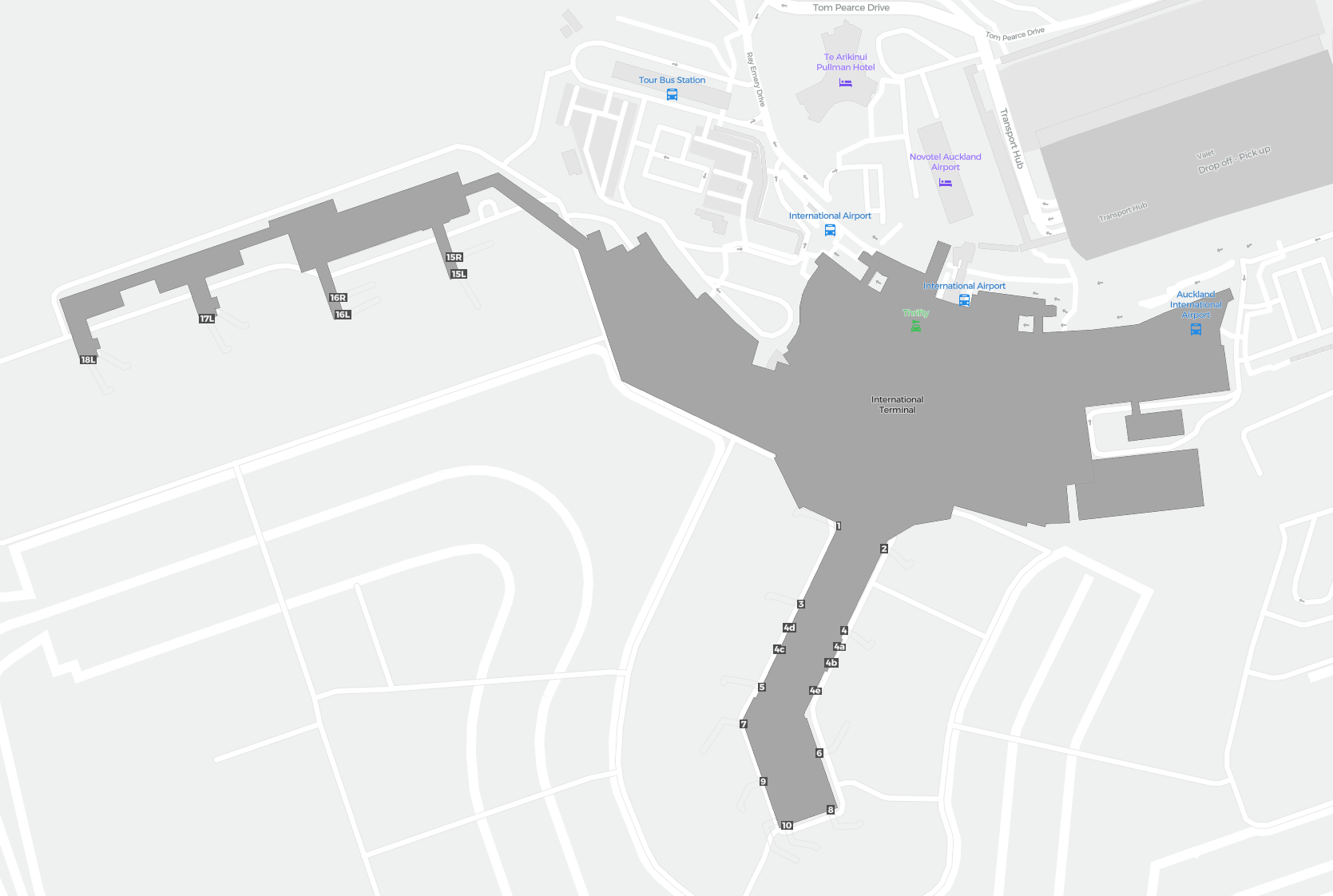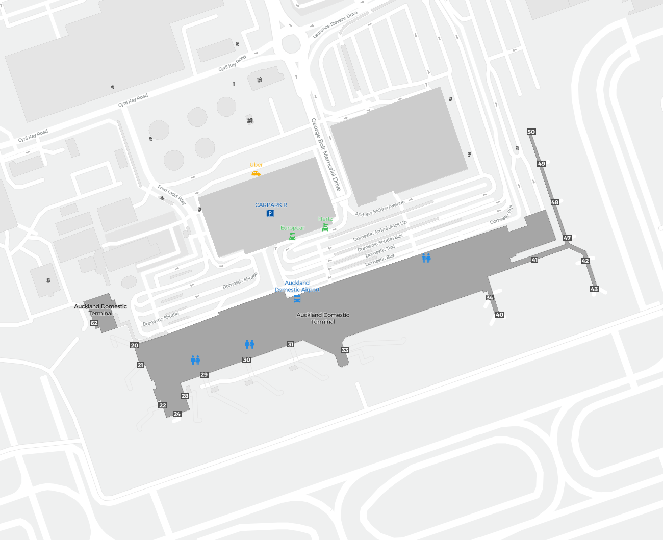 Este es un mapa ampliable de Auckland (AKL). Ofrece una visión general del exterior con terminales y estacionamientos. En algunos aeropuertos también muestra detalles de puertas, servicios de coches de alquiler y otras comodidades al hacer zoom.