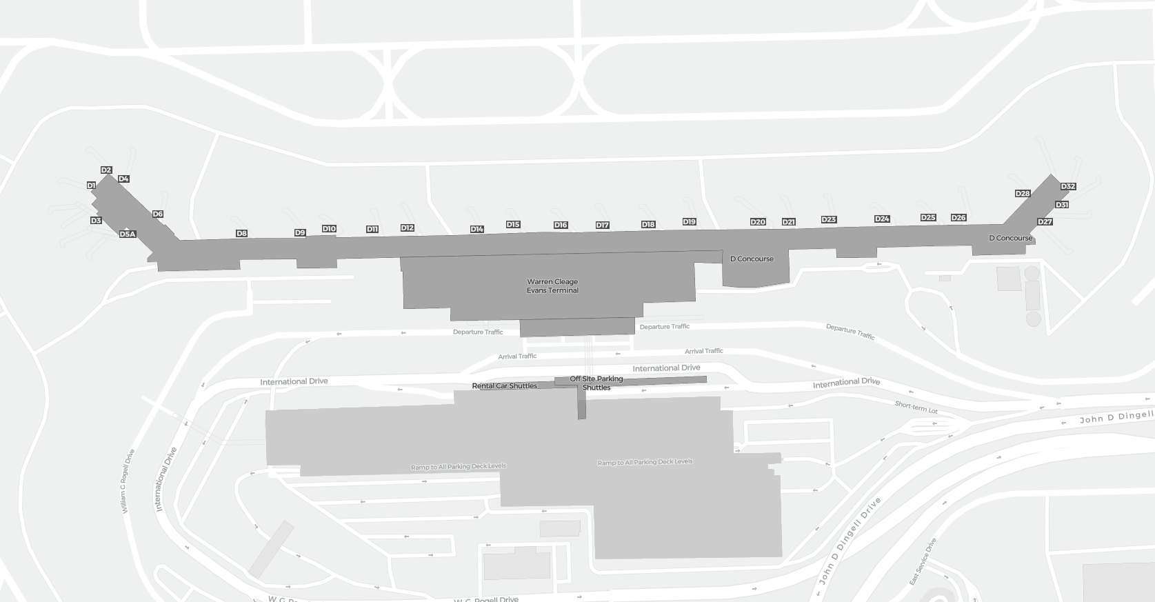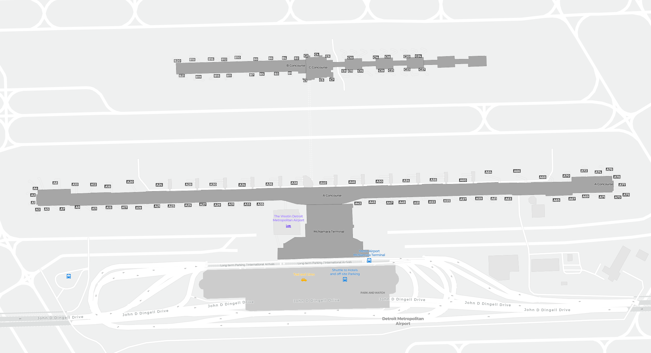 Este es un mapa ampliable de Detroit (DTW). Ofrece una visión general del exterior con terminales y estacionamientos. En algunos aeropuertos también muestra detalles de puertas, servicios de coches de alquiler y otras comodidades al hacer zoom.
