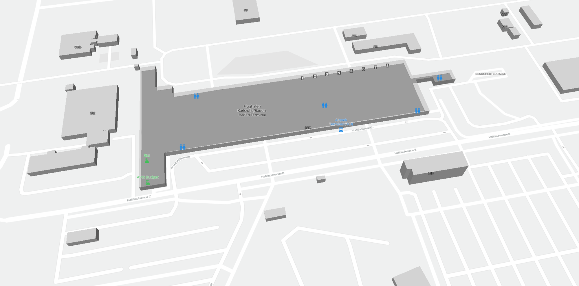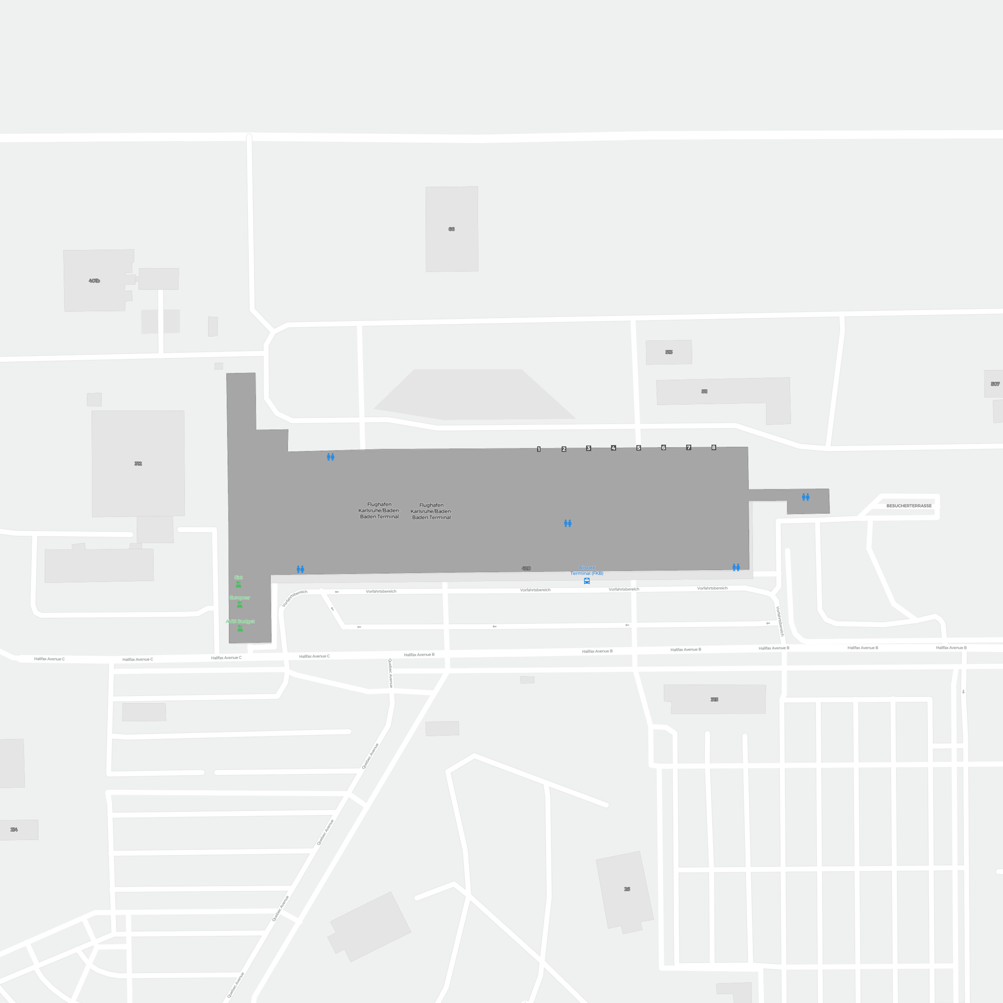 Este es un mapa ampliable de Karlsruhe (FKB). Ofrece una visión general del exterior con terminales y estacionamientos. En algunos aeropuertos también muestra detalles de puertas, servicios de coches de alquiler y otras comodidades al hacer zoom.