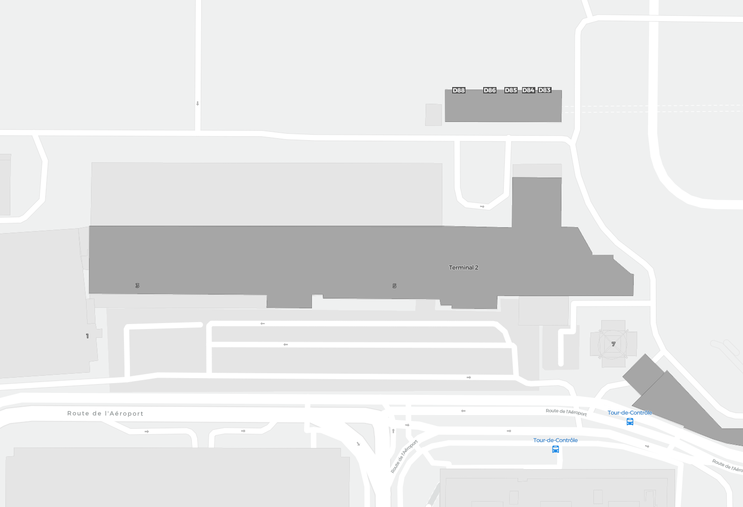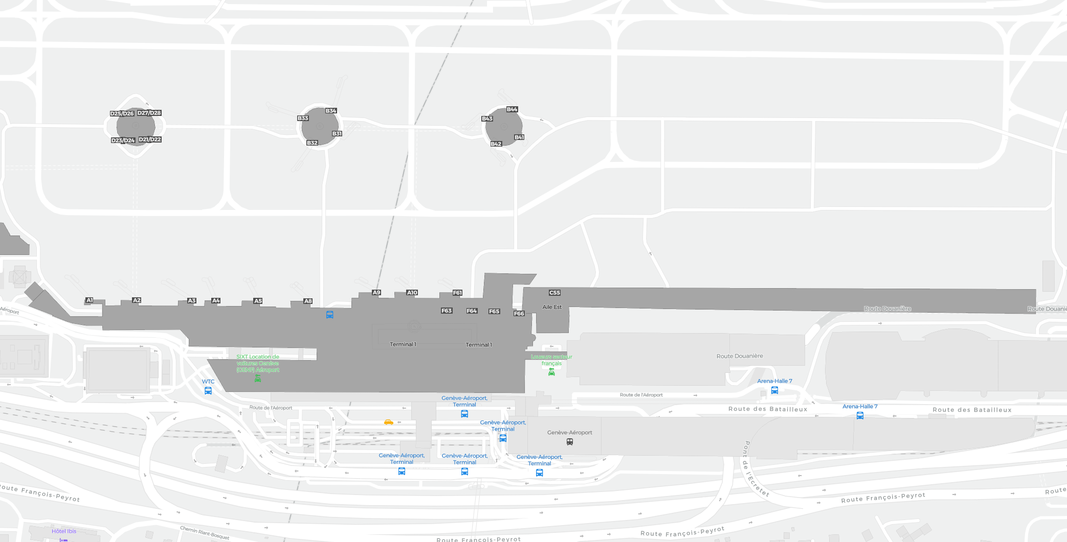 Este es un mapa ampliable de Ginebra (GVA). Ofrece una visión general del exterior con terminales y estacionamientos. En algunos aeropuertos también muestra detalles de puertas, servicios de coches de alquiler y otras comodidades al hacer zoom.