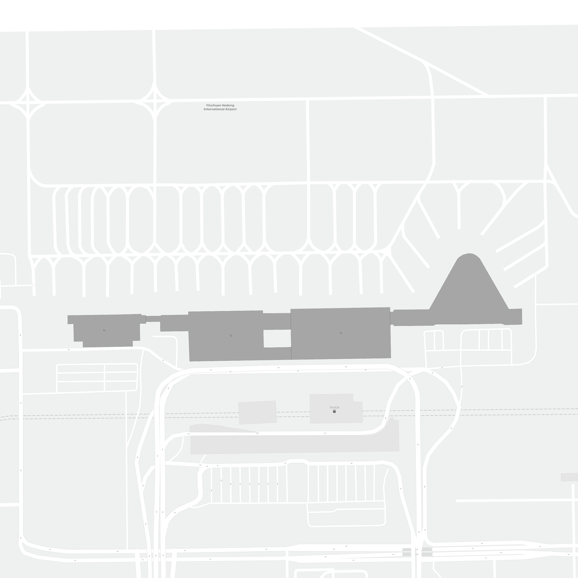 Este es un mapa ampliable de Yinchuan (INC). Muestra una vista general del exterior, con las terminales y los aparcamientos. En algunos aeropuertos, al acercar el zoom, también podrás ver detalles de las puertas de embarque, servicios de alquiler de coches y otras instalaciones.