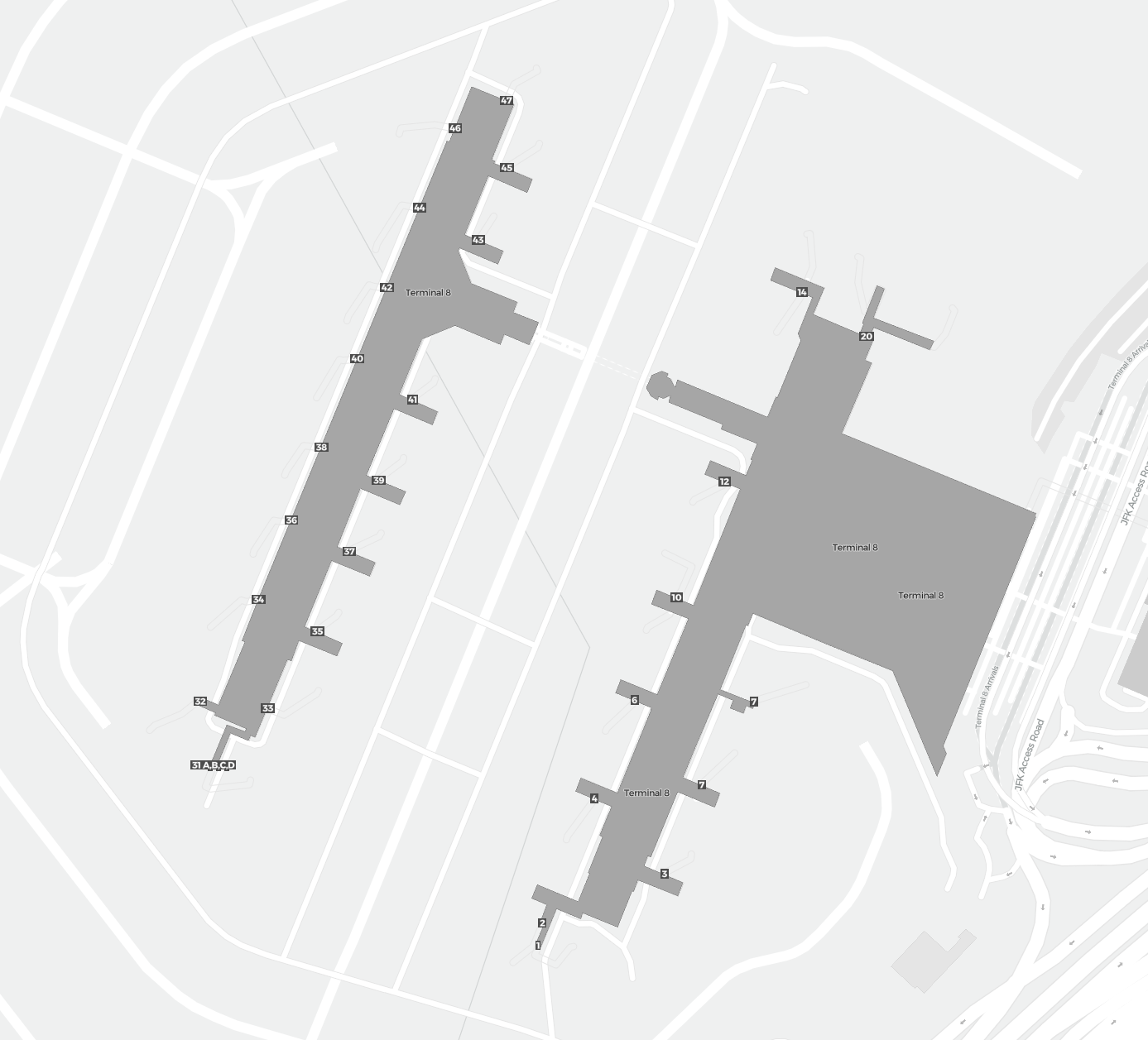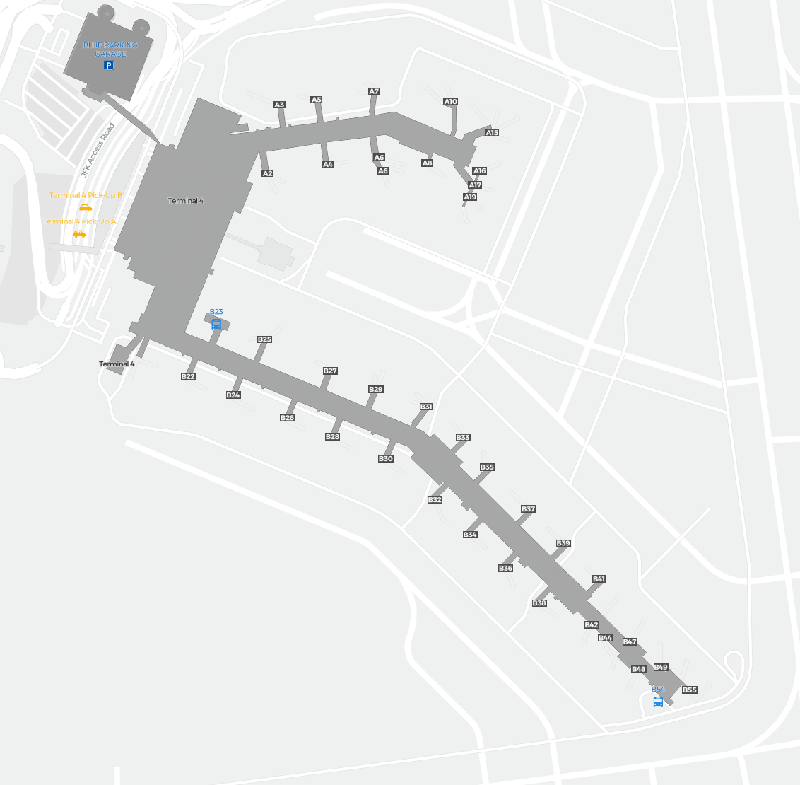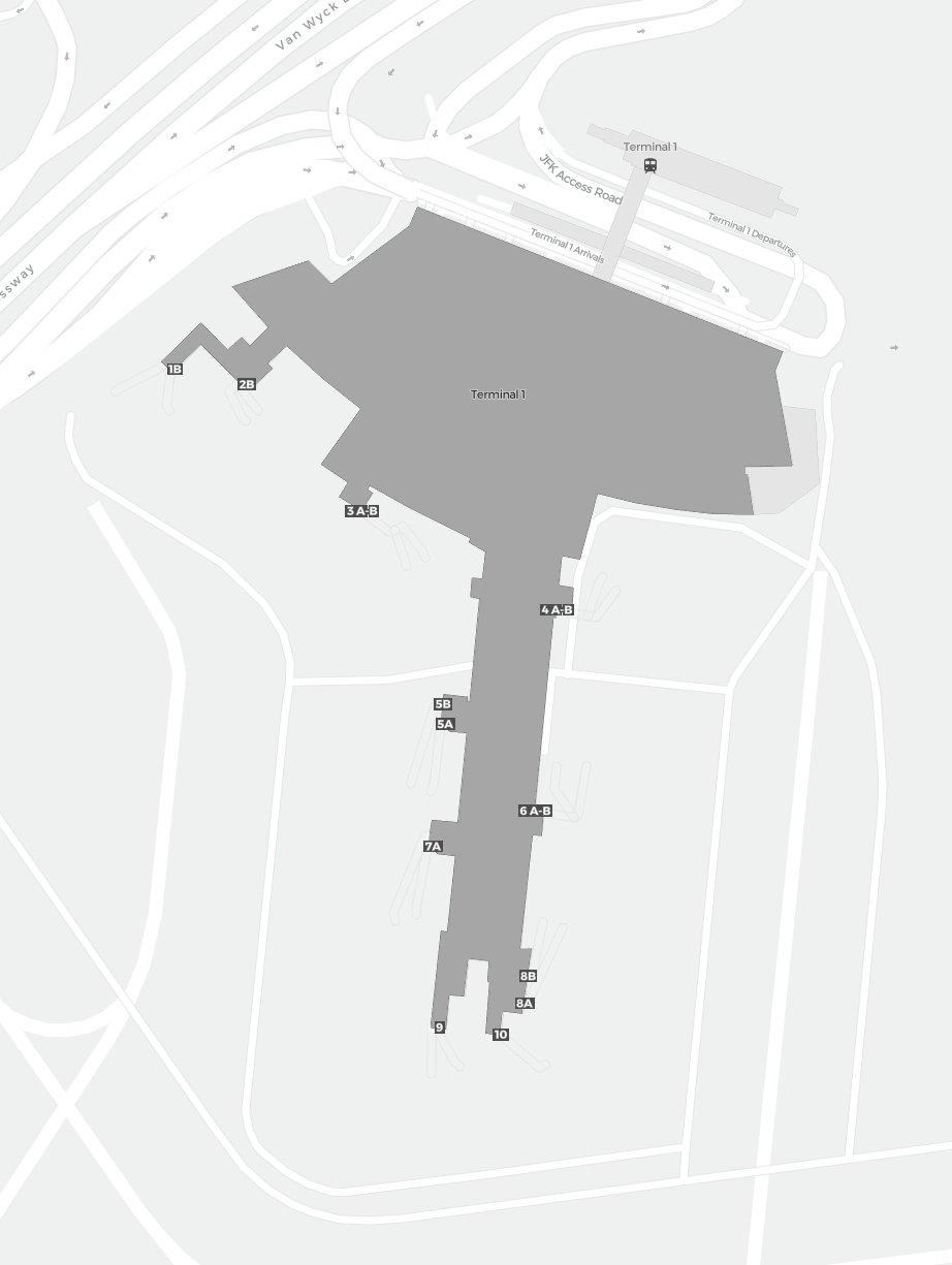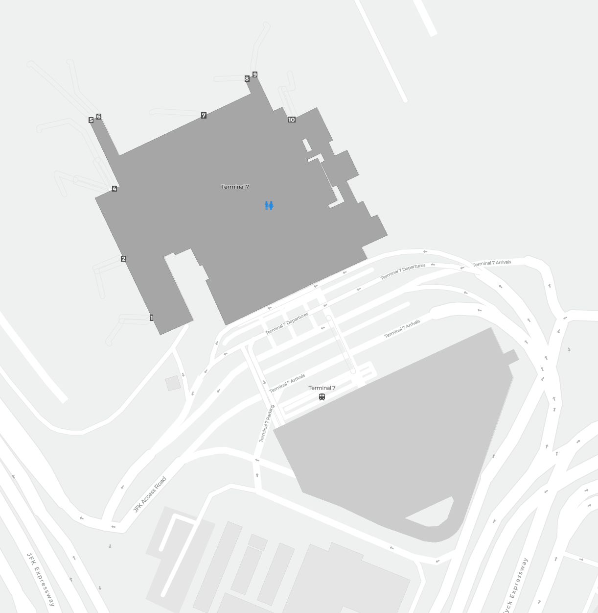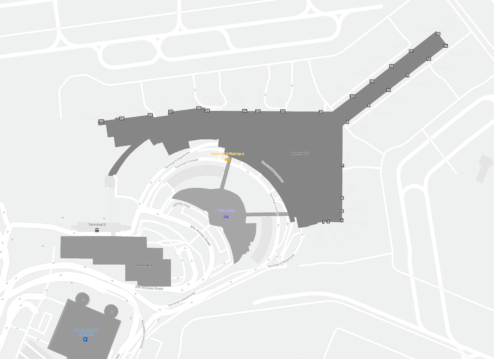 Este es un mapa ampliable de Nueva York (JFK). Ofrece una visión general del exterior con terminales y estacionamientos. En algunos aeropuertos también muestra detalles de puertas, servicios de coches de alquiler y otras comodidades al hacer zoom.