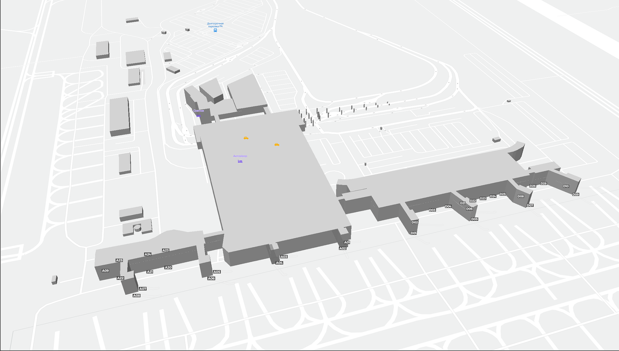 Este es un mapa ampliable de San Petersburgo (LED). Muestra una vista general del exterior, con las terminales y los aparcamientos. En algunos aeropuertos, al acercar el zoom, también podrás ver detalles de las puertas de embarque, servicios de alquiler de coches y otras instalaciones.