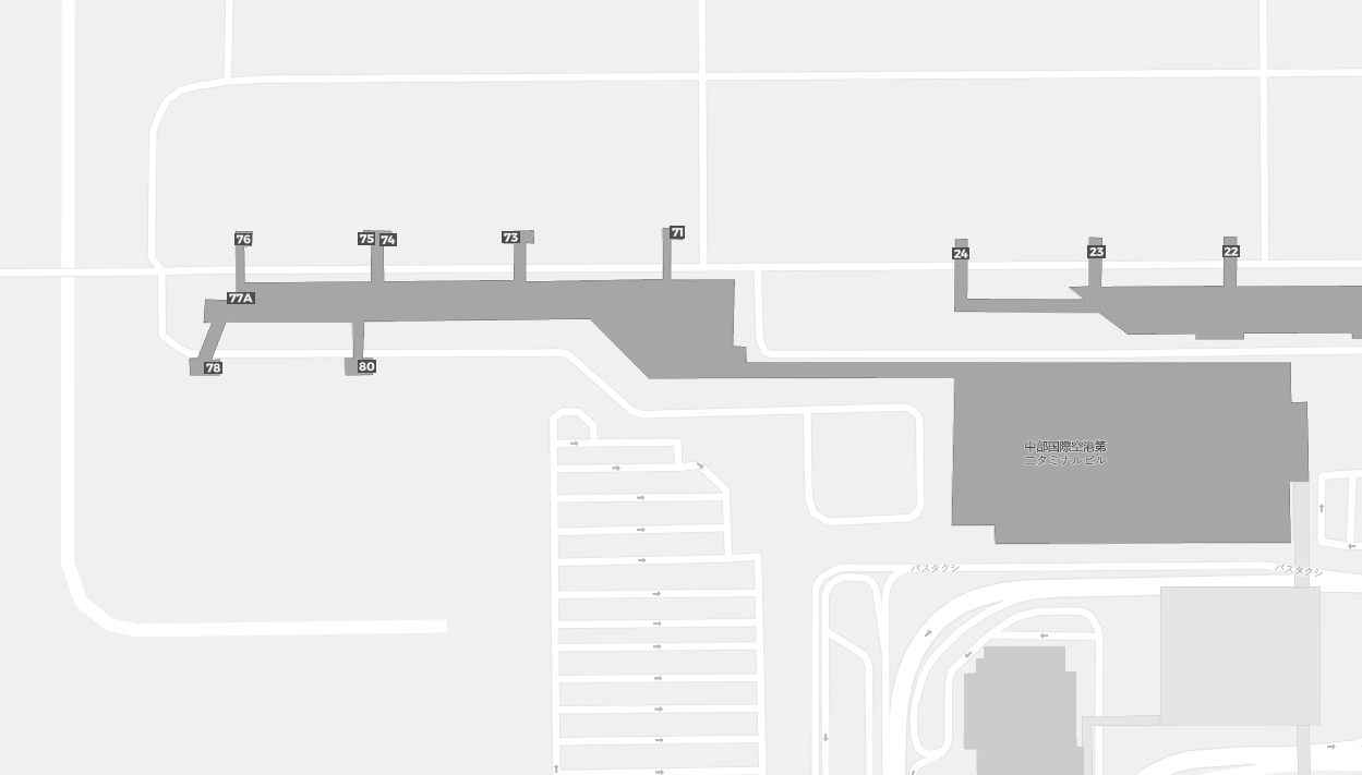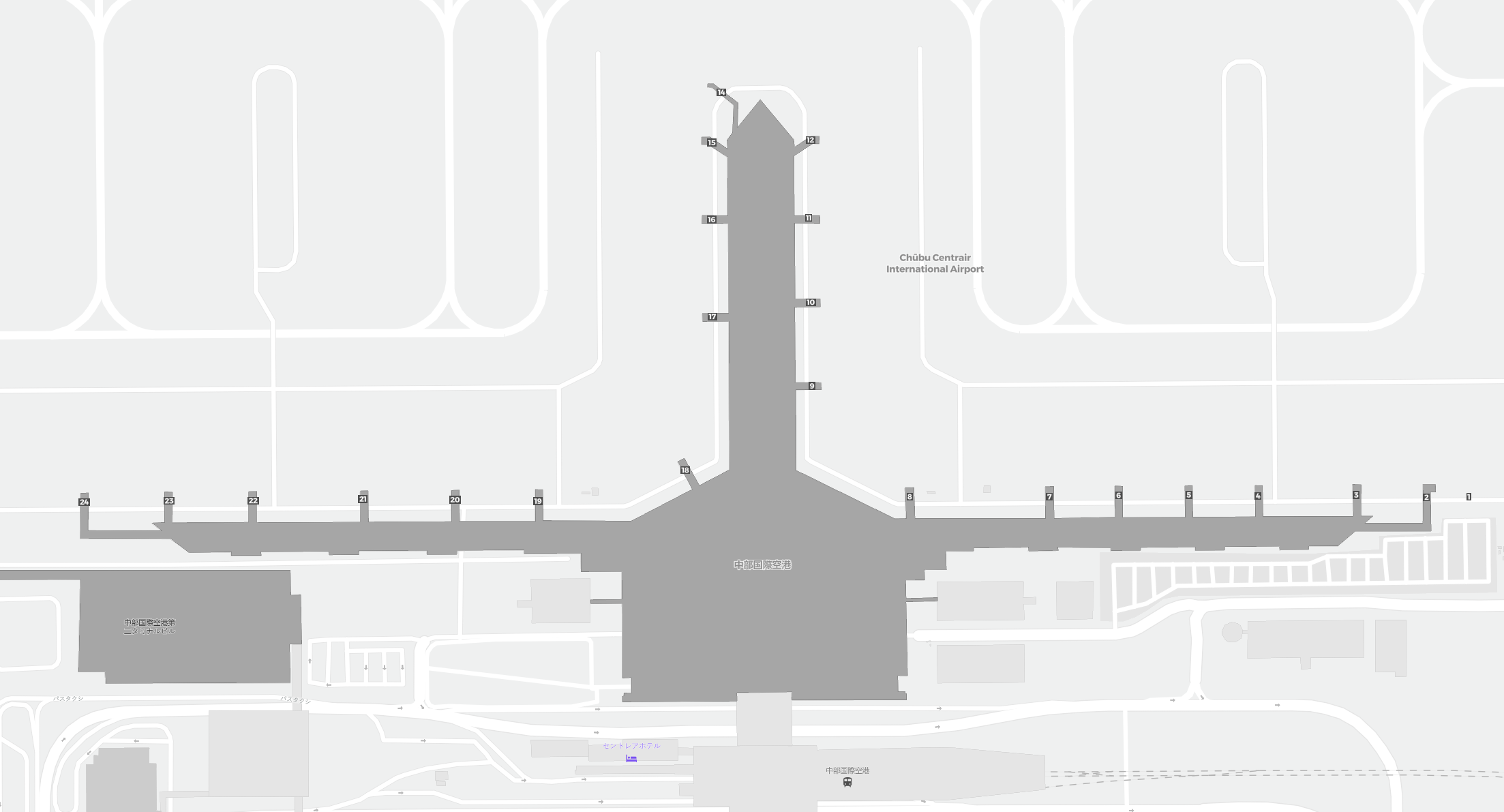 Este es un mapa ampliable de Nagoya (NGO). Ofrece una visión general del exterior con terminales y estacionamientos. En algunos aeropuertos también muestra detalles de puertas, servicios de coches de alquiler y otras comodidades al hacer zoom.