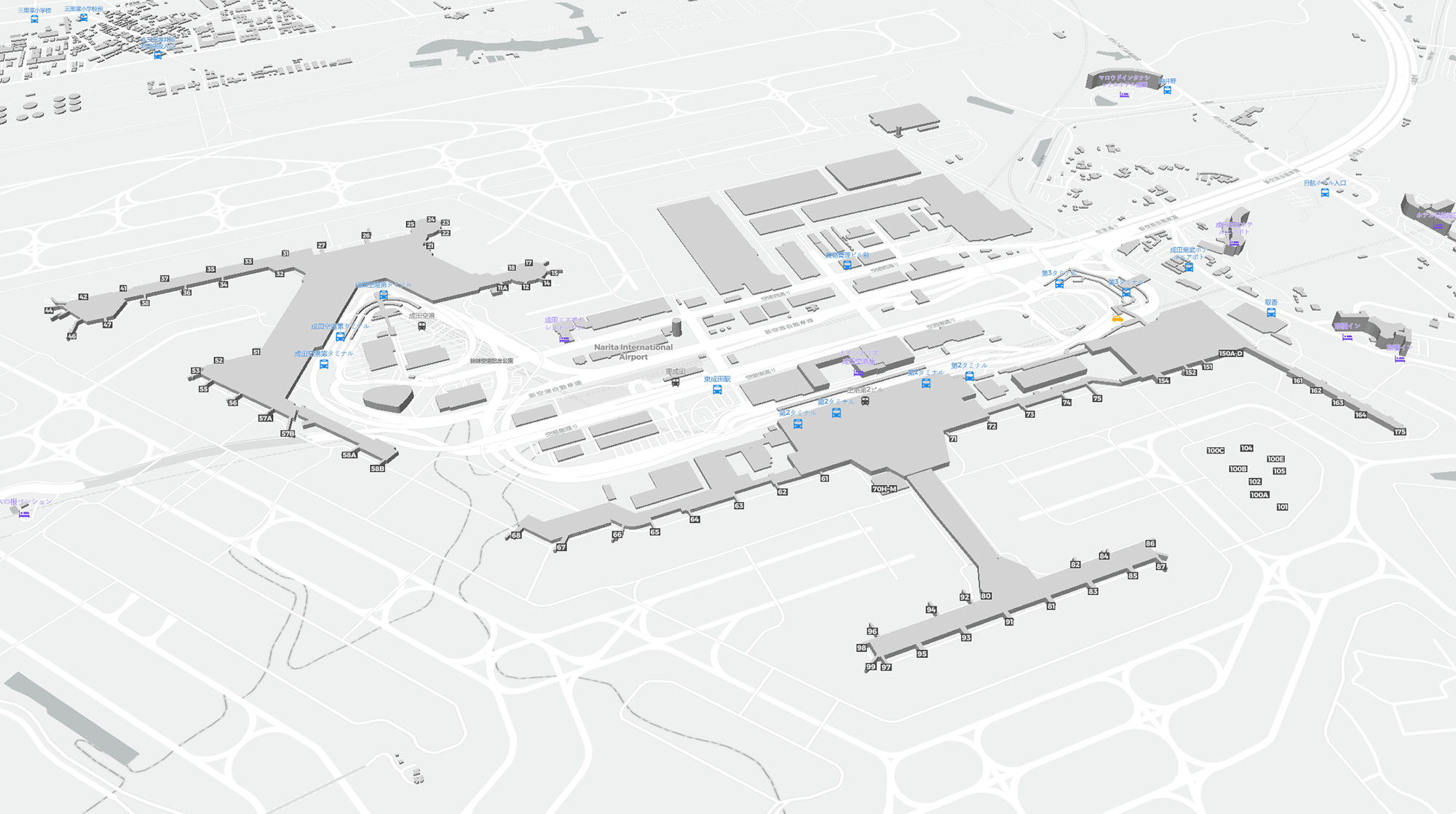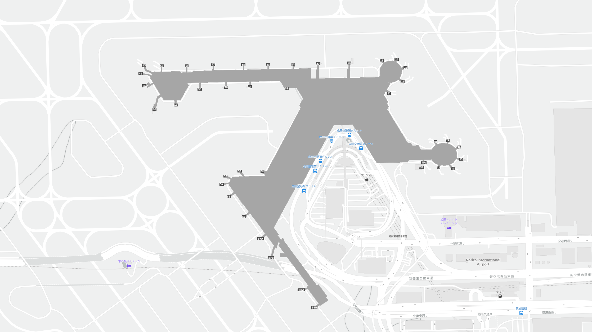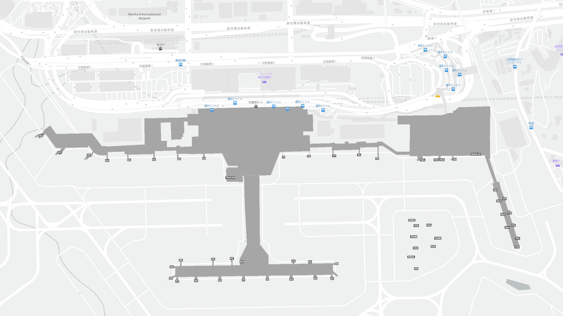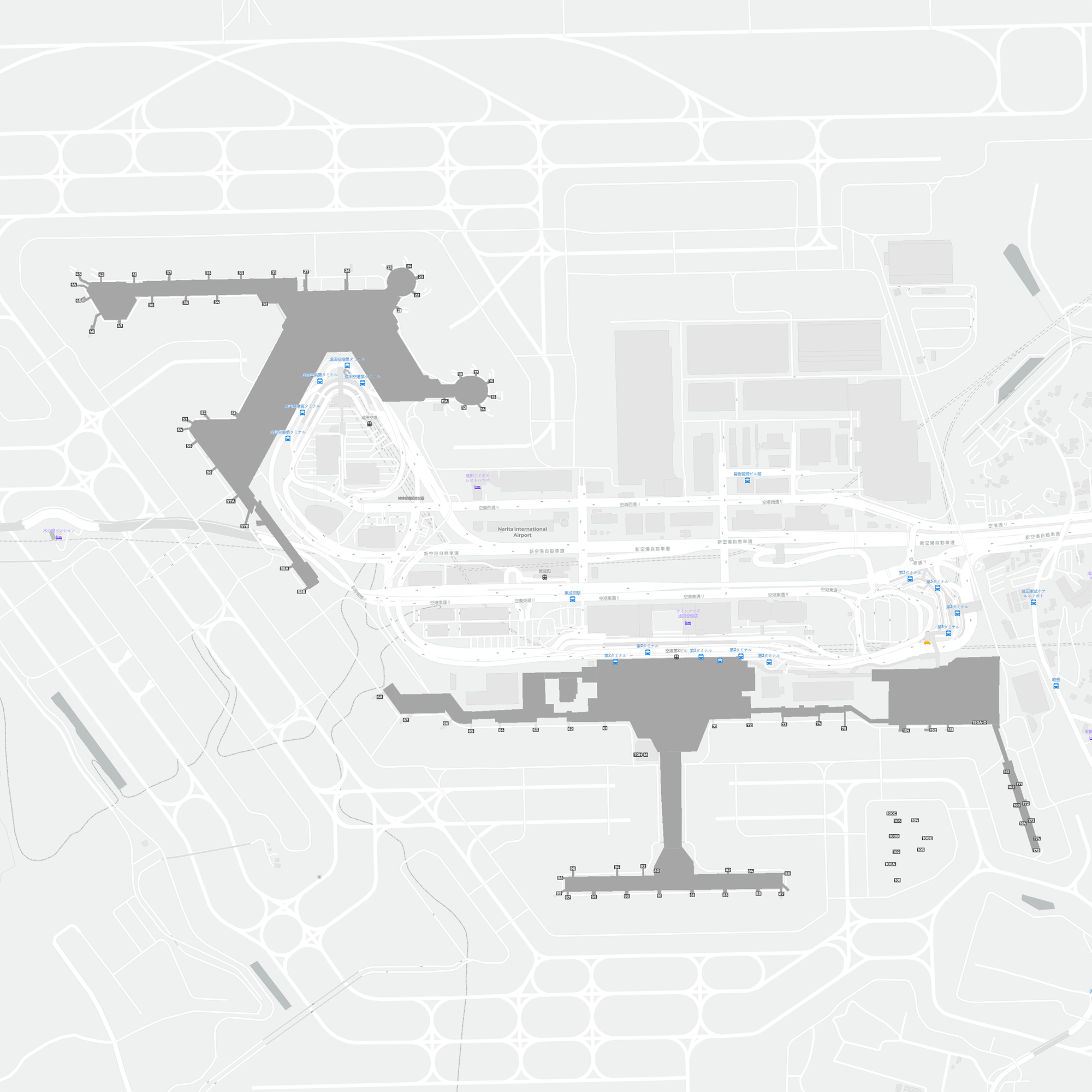 Este es un mapa ampliable de Tokio (NRT). Ofrece una visión general del exterior con terminales y estacionamientos. En algunos aeropuertos también muestra detalles de puertas, servicios de coches de alquiler y otras comodidades al hacer zoom.
