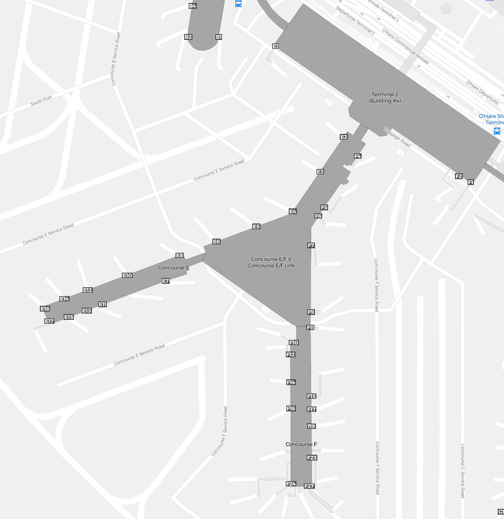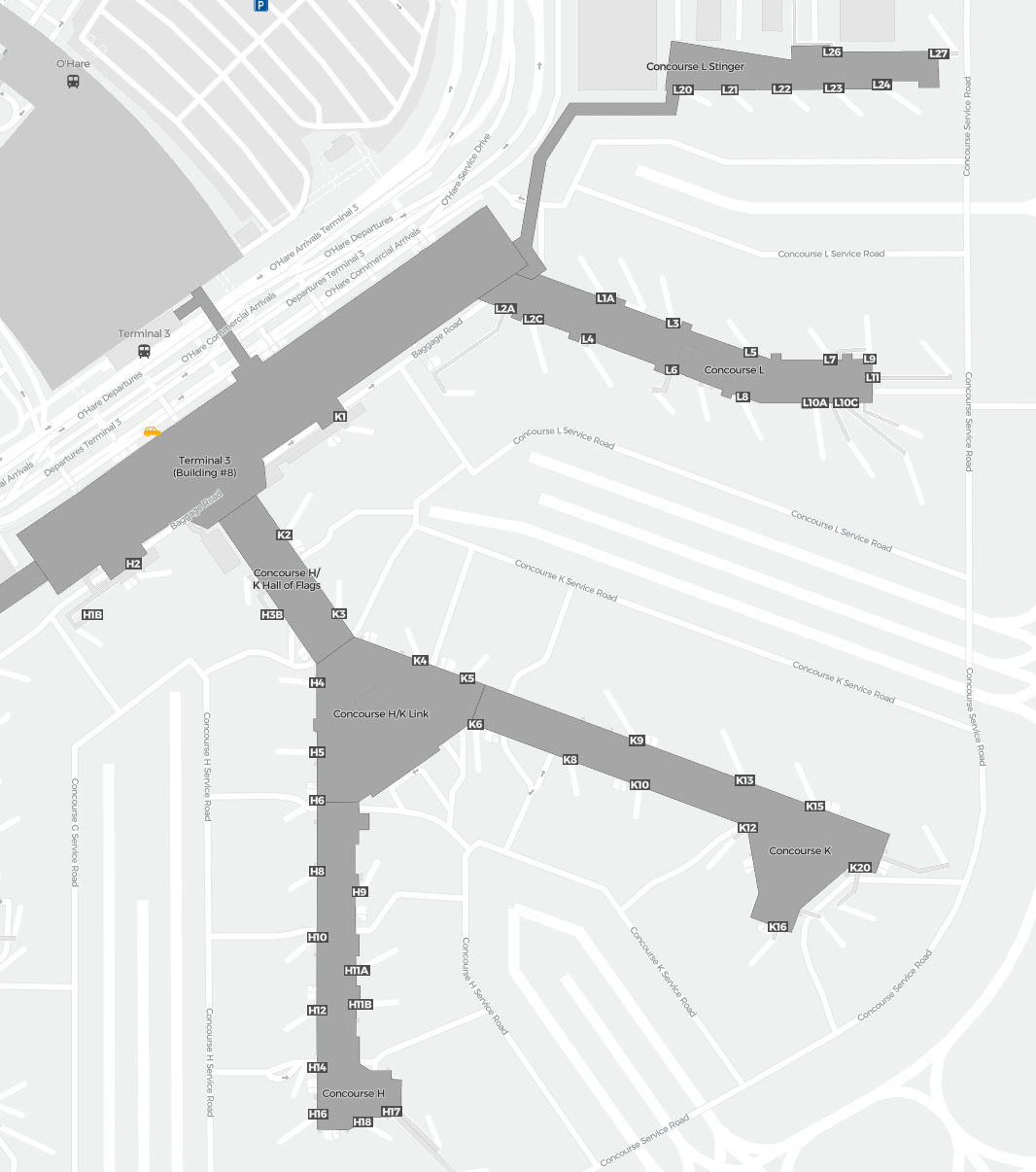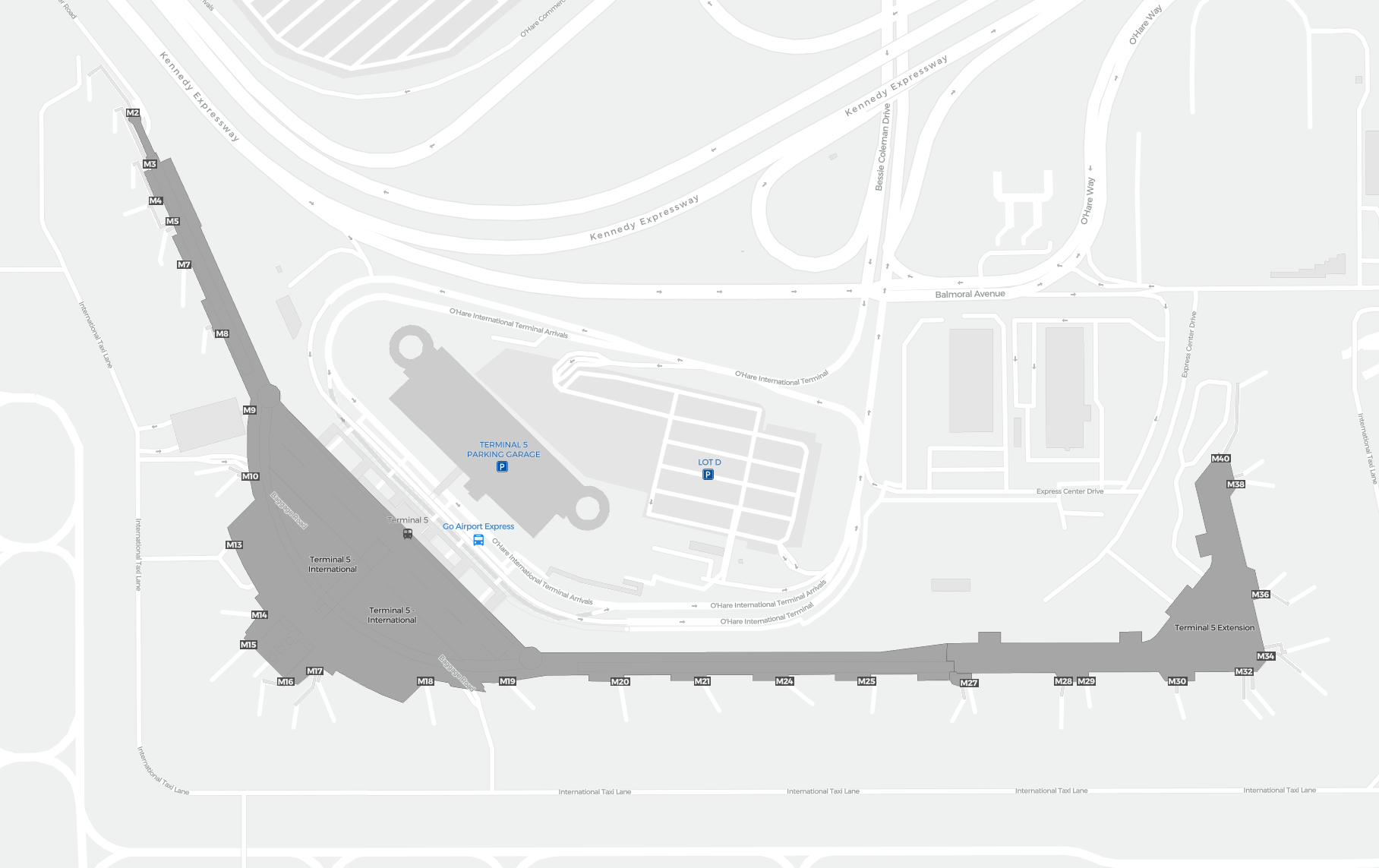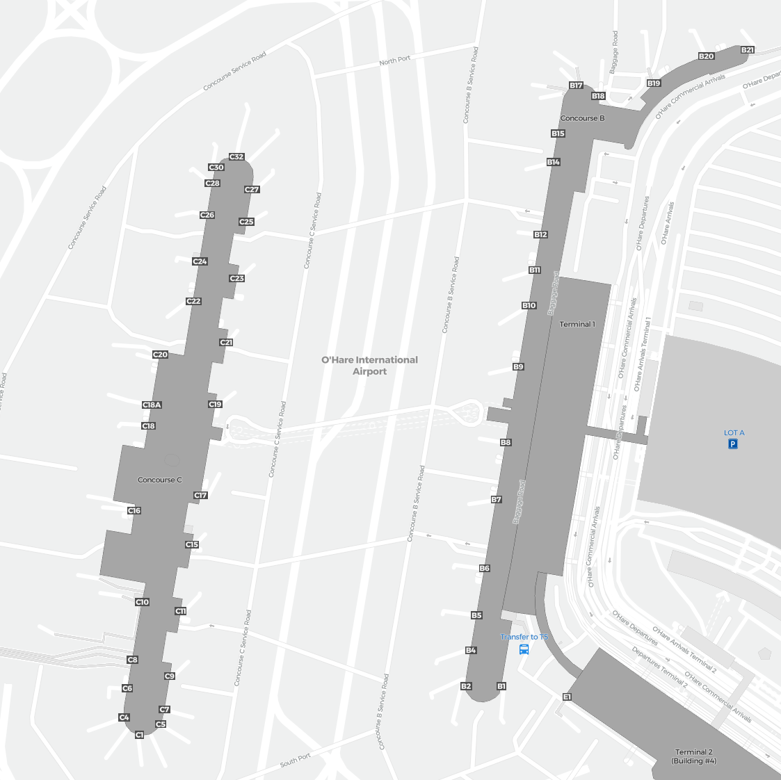 Este es un mapa ampliable de Chicago (ORD). Ofrece una visión general del exterior con terminales y estacionamientos. En algunos aeropuertos también muestra detalles de puertas, servicios de coches de alquiler y otras comodidades al hacer zoom.