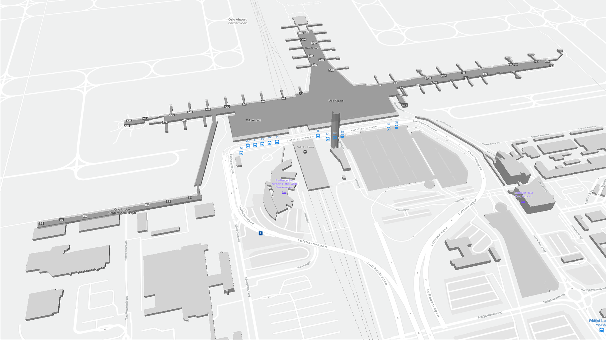 Este es un mapa ampliable de Oslo (OSL). Ofrece una visión general del exterior con terminales y estacionamientos. En algunos aeropuertos también muestra detalles de puertas, servicios de coches de alquiler y otras comodidades al hacer zoom.