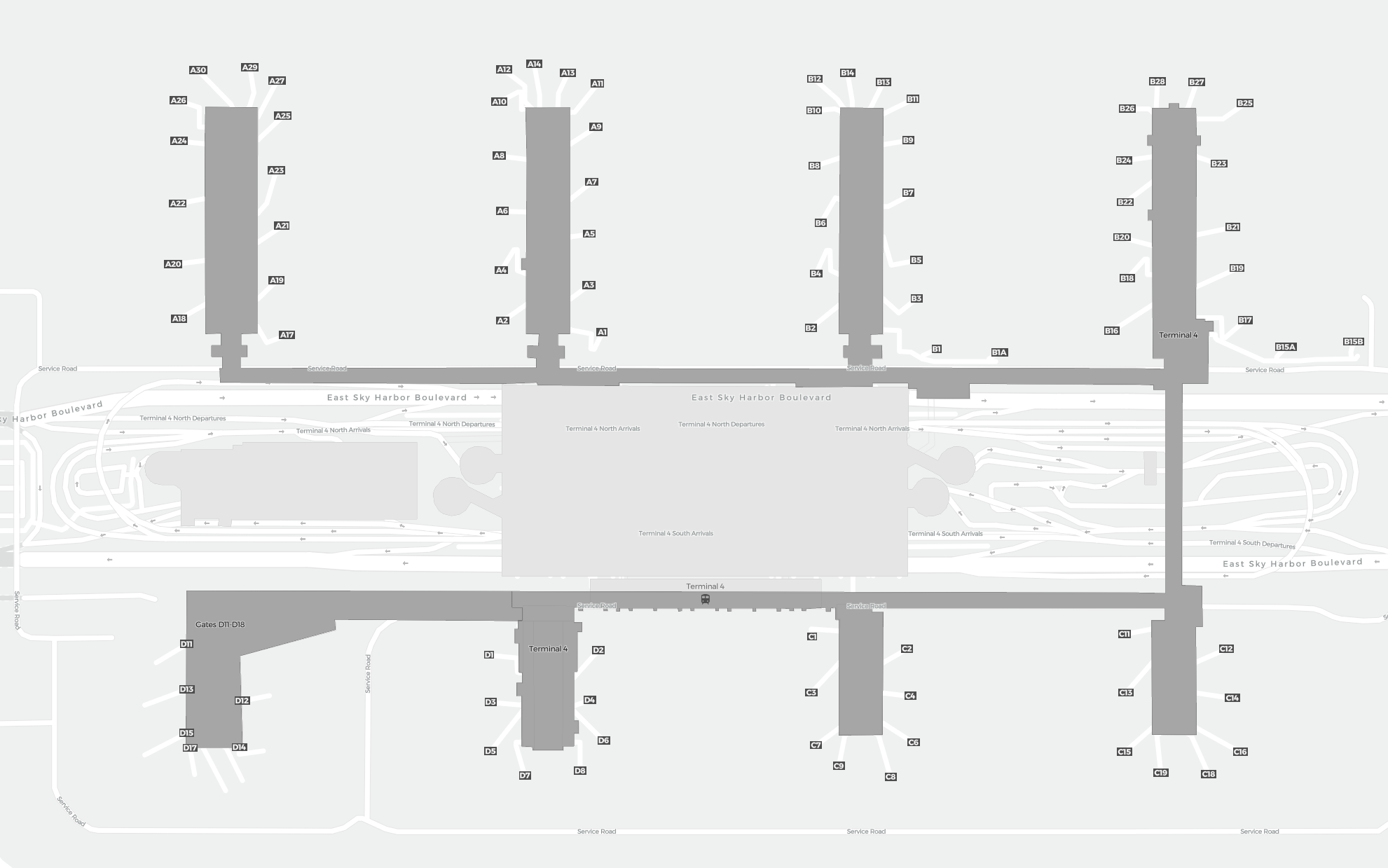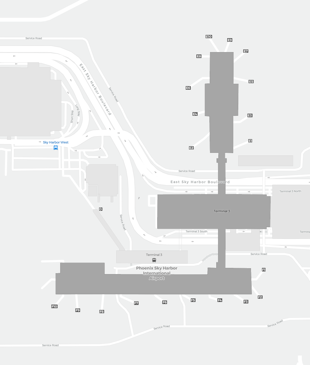 Este es un mapa ampliable de Phoenix (PHX). Ofrece una visión general del exterior con terminales y estacionamientos. En algunos aeropuertos también muestra detalles de puertas, servicios de coches de alquiler y otras comodidades al hacer zoom.