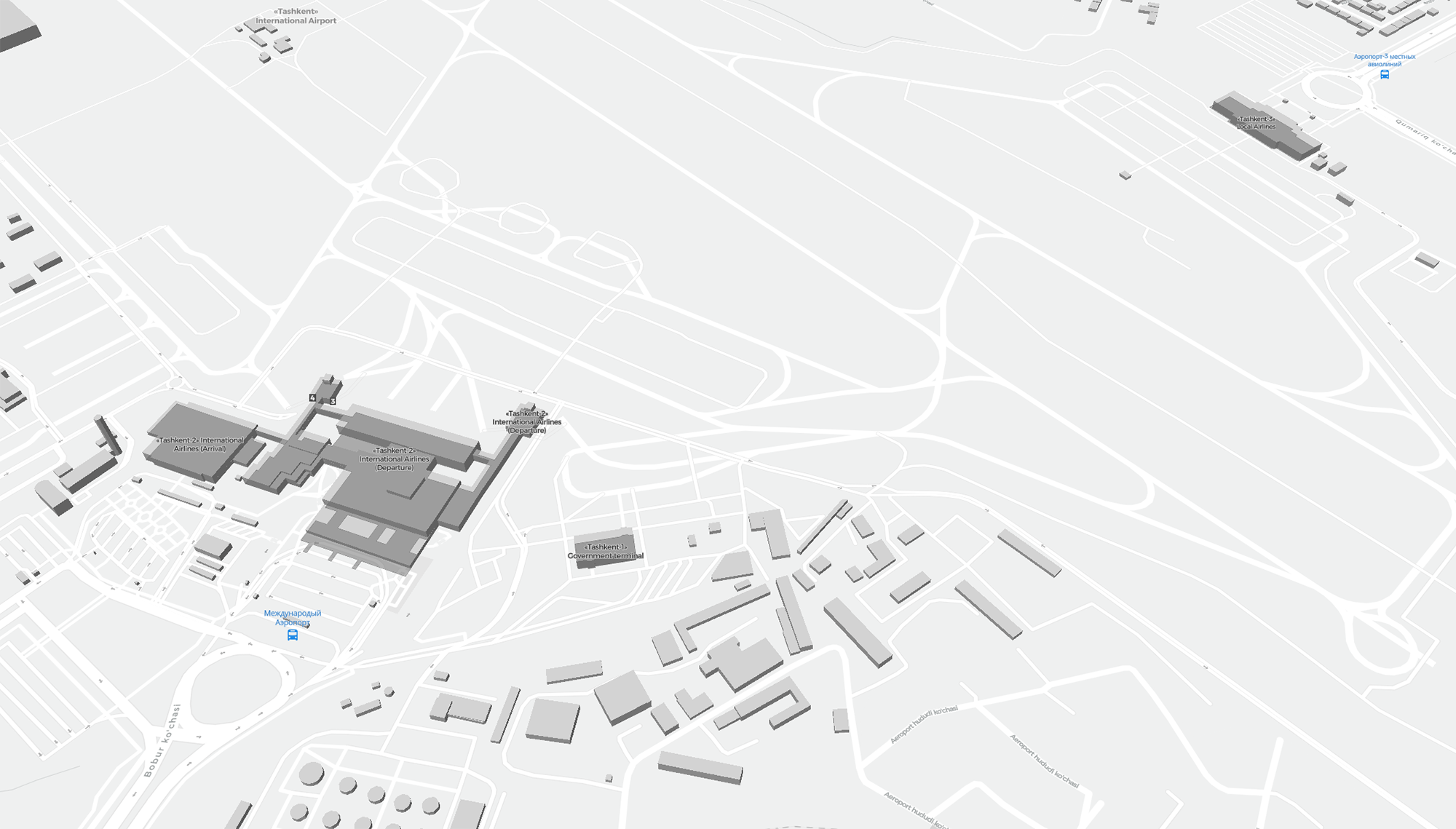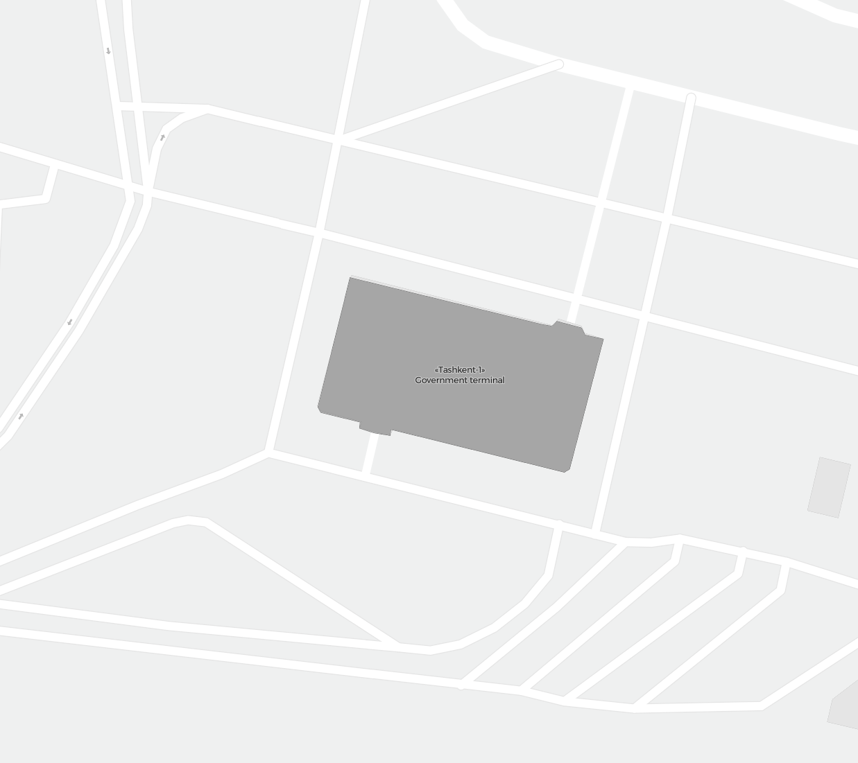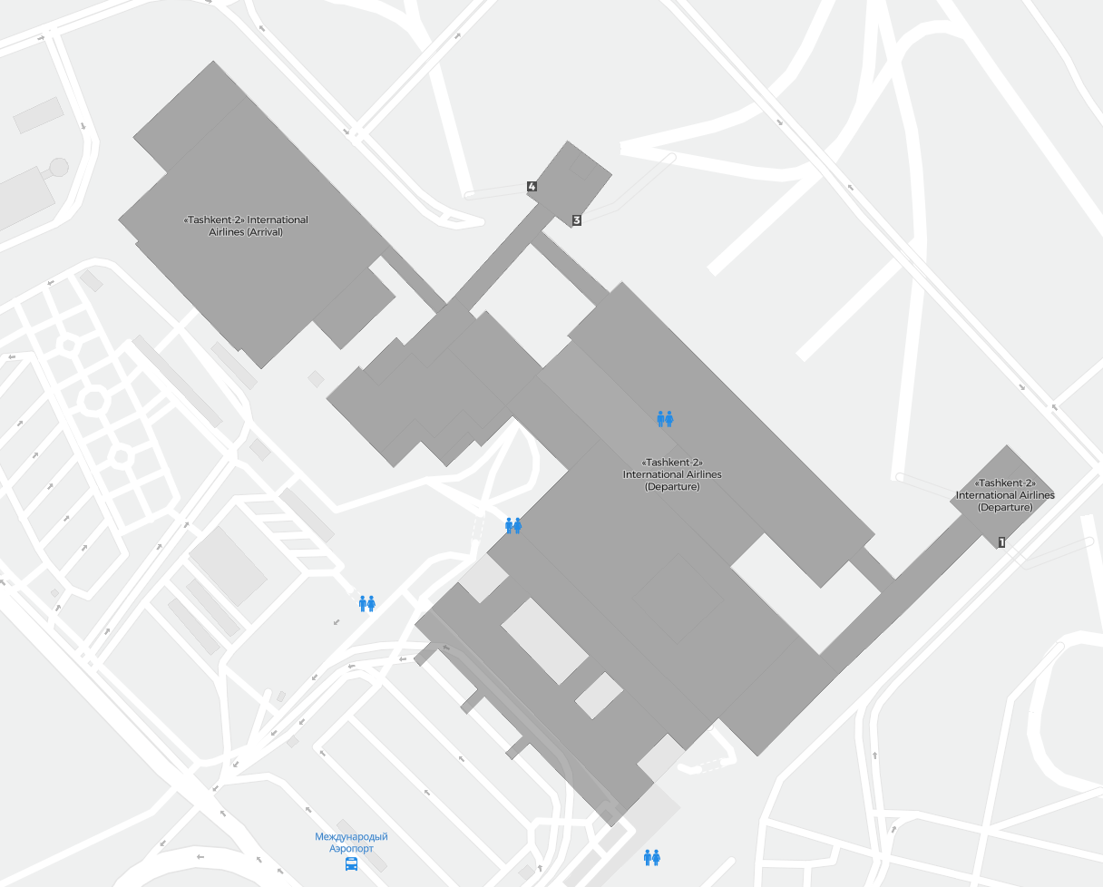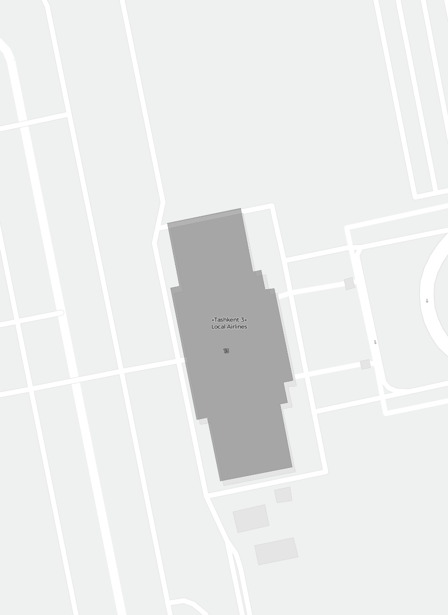 Este es un mapa ampliable de Taskent (TAS). Muestra una vista general del exterior, con las terminales y los aparcamientos. En algunos aeropuertos, al acercar el zoom, también podrás ver detalles de las puertas de embarque, servicios de alquiler de coches y otras instalaciones.