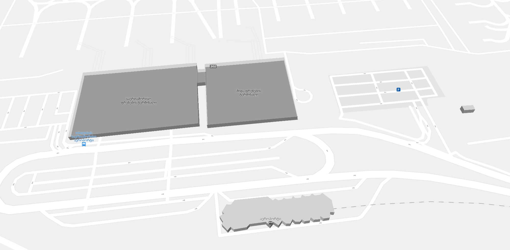 Este es un mapa ampliable de Tiflis (TBS). Muestra una vista general del exterior, con las terminales y los aparcamientos. En algunos aeropuertos, al acercar el zoom, también podrás ver detalles de las puertas de embarque, servicios de alquiler de coches y otras instalaciones.