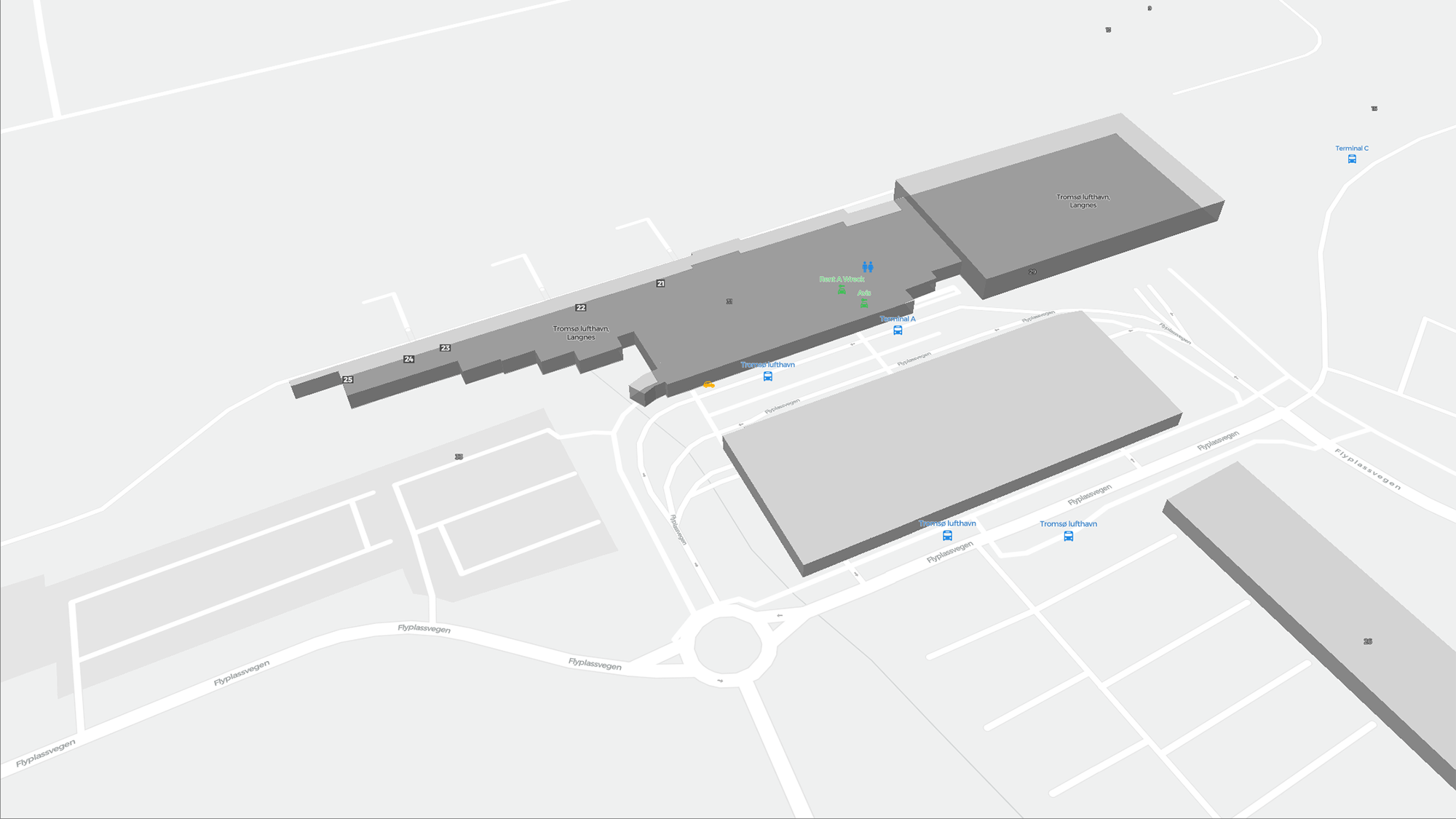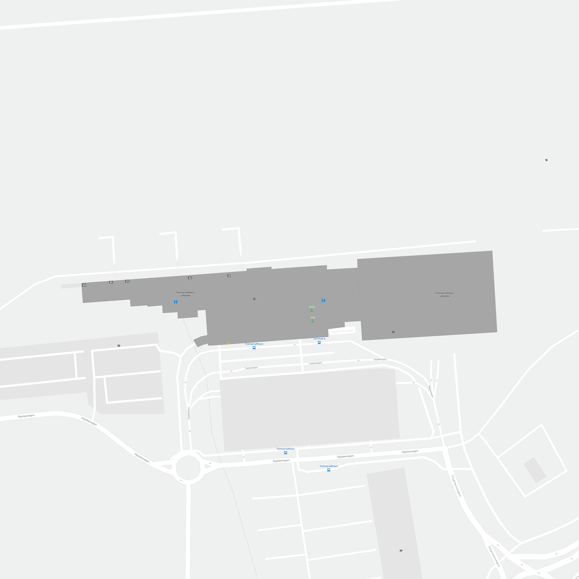 Este es un mapa ampliable de Tromso (TOS). Ofrece una visión general del exterior con terminales y estacionamientos. En algunos aeropuertos también muestra detalles de puertas, servicios de coches de alquiler y otras comodidades al hacer zoom.